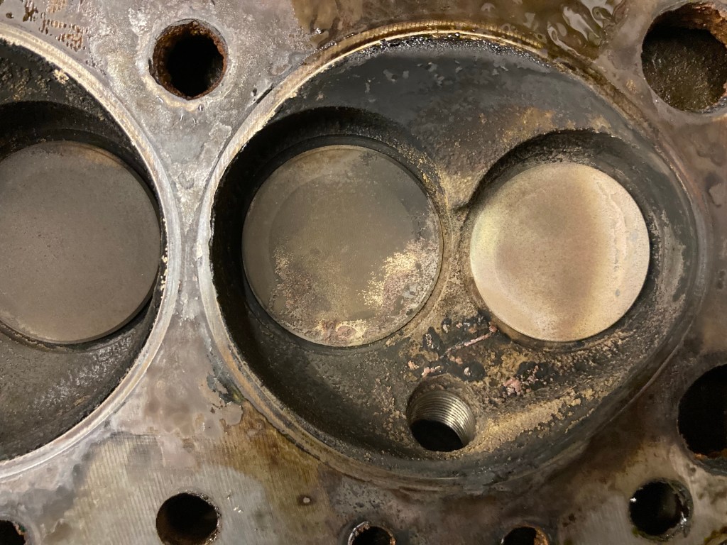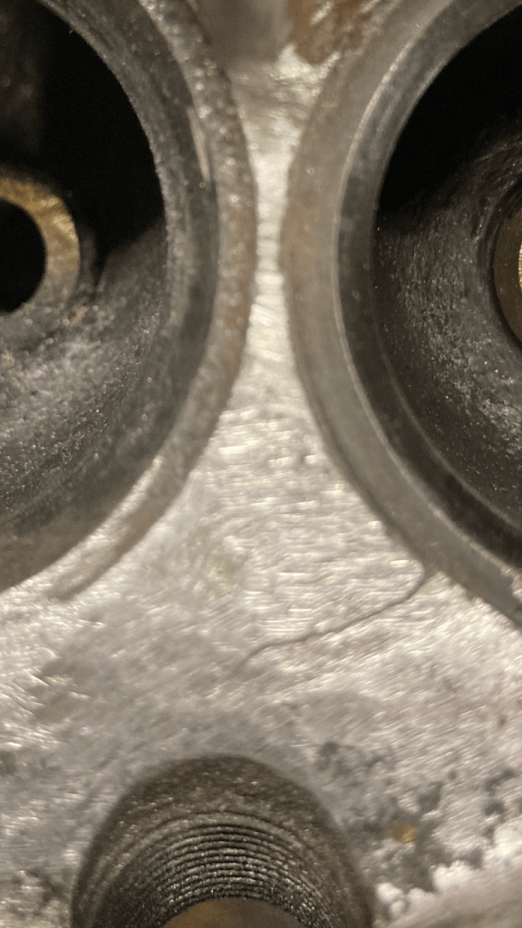 Cracked cylinder head – number 4 cylinder, between exhaust valve seat and plug aperture.