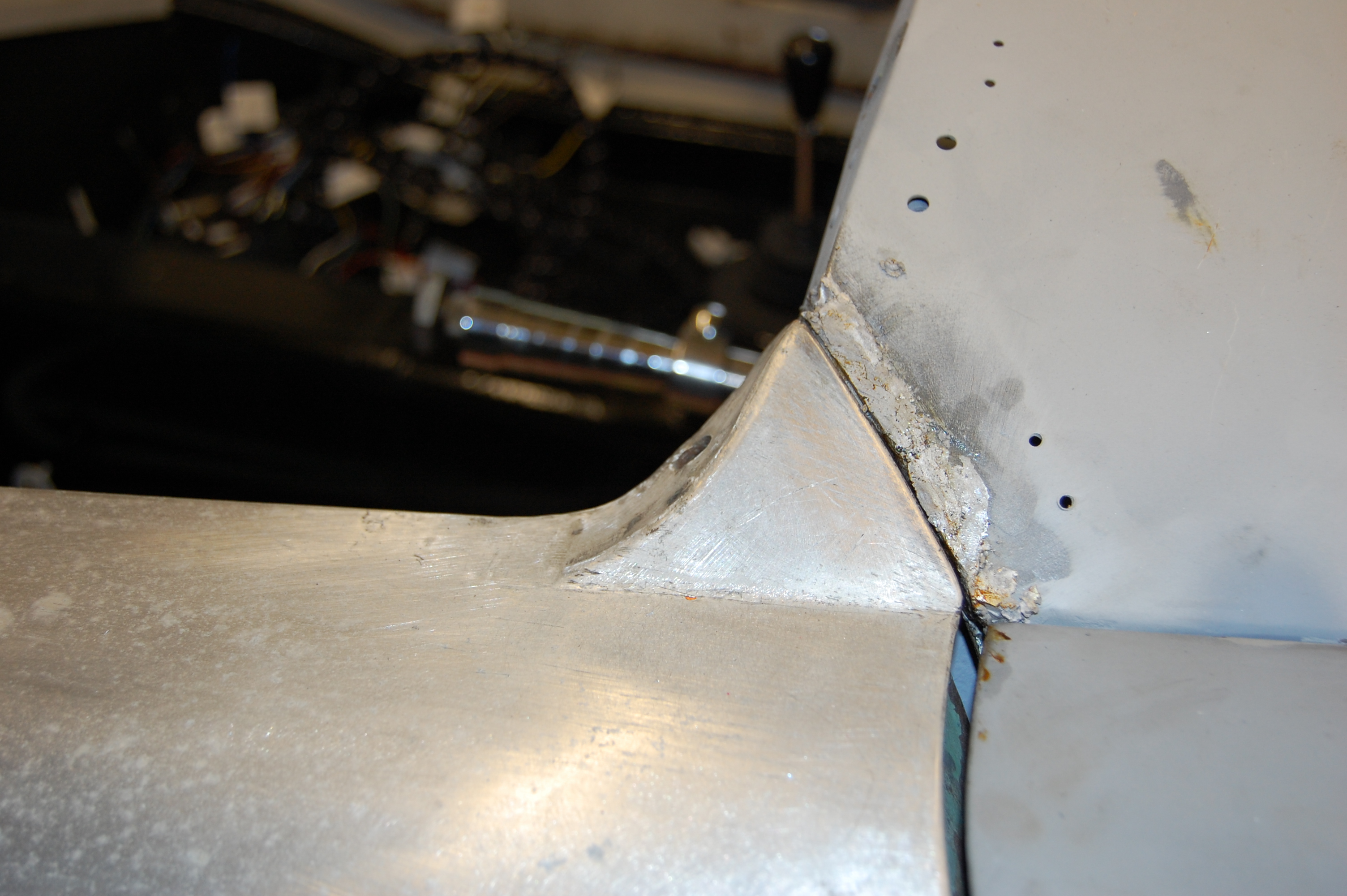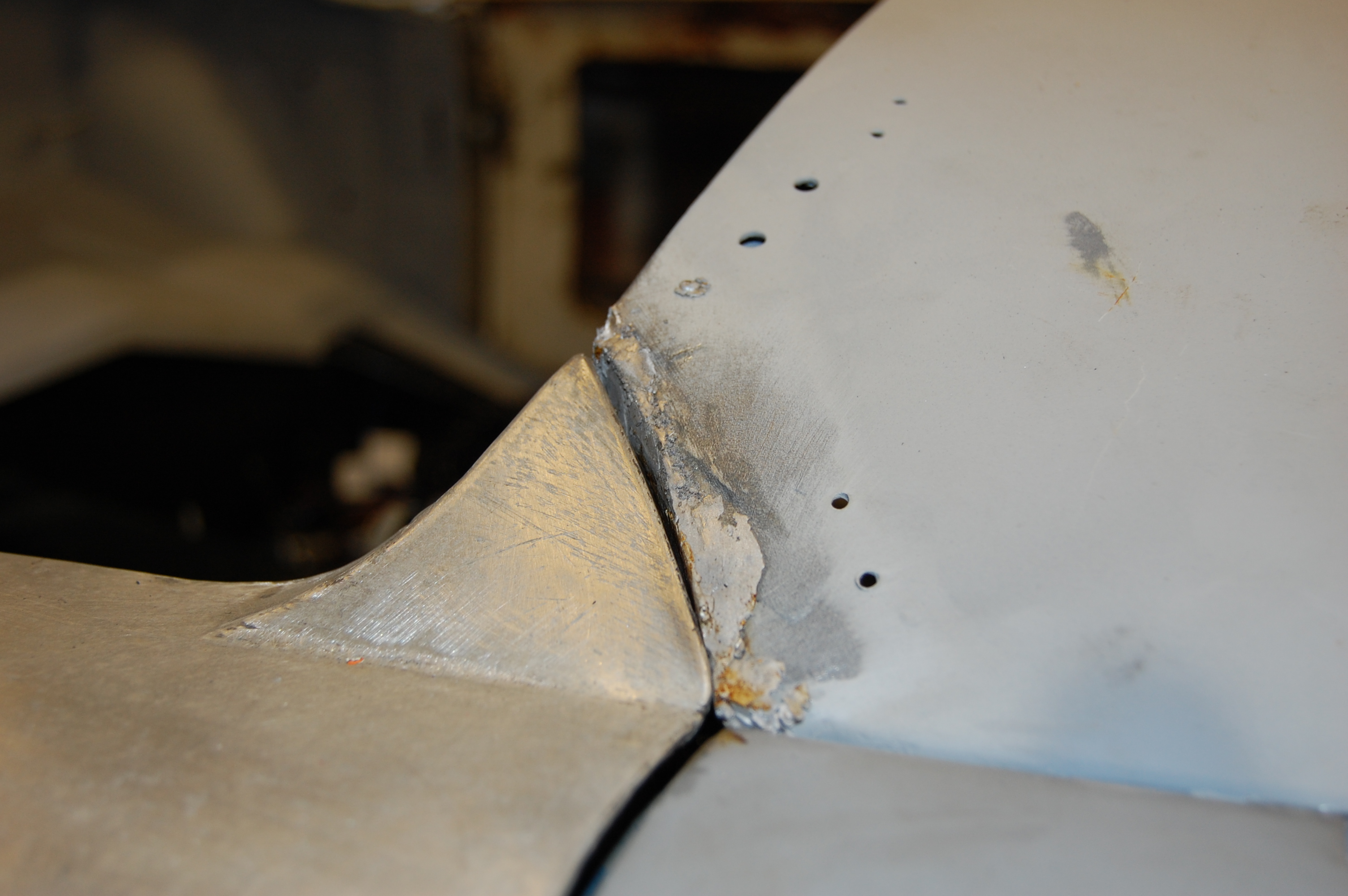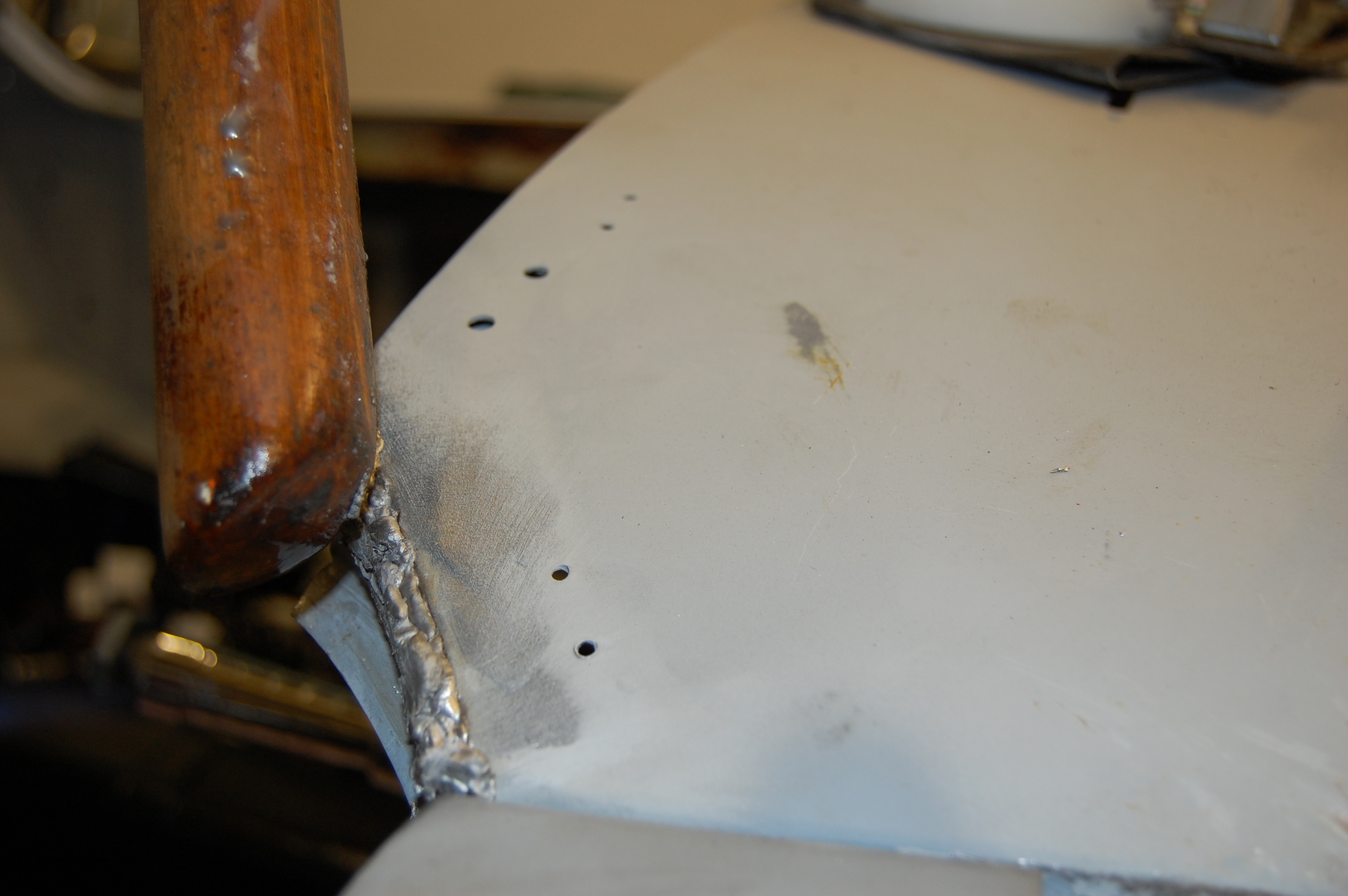 On both sides the door to scuttle gap was too wide and needed closing. The only credible way is to do as the factory did and lead load it. This shot shows the original factory leadwork.