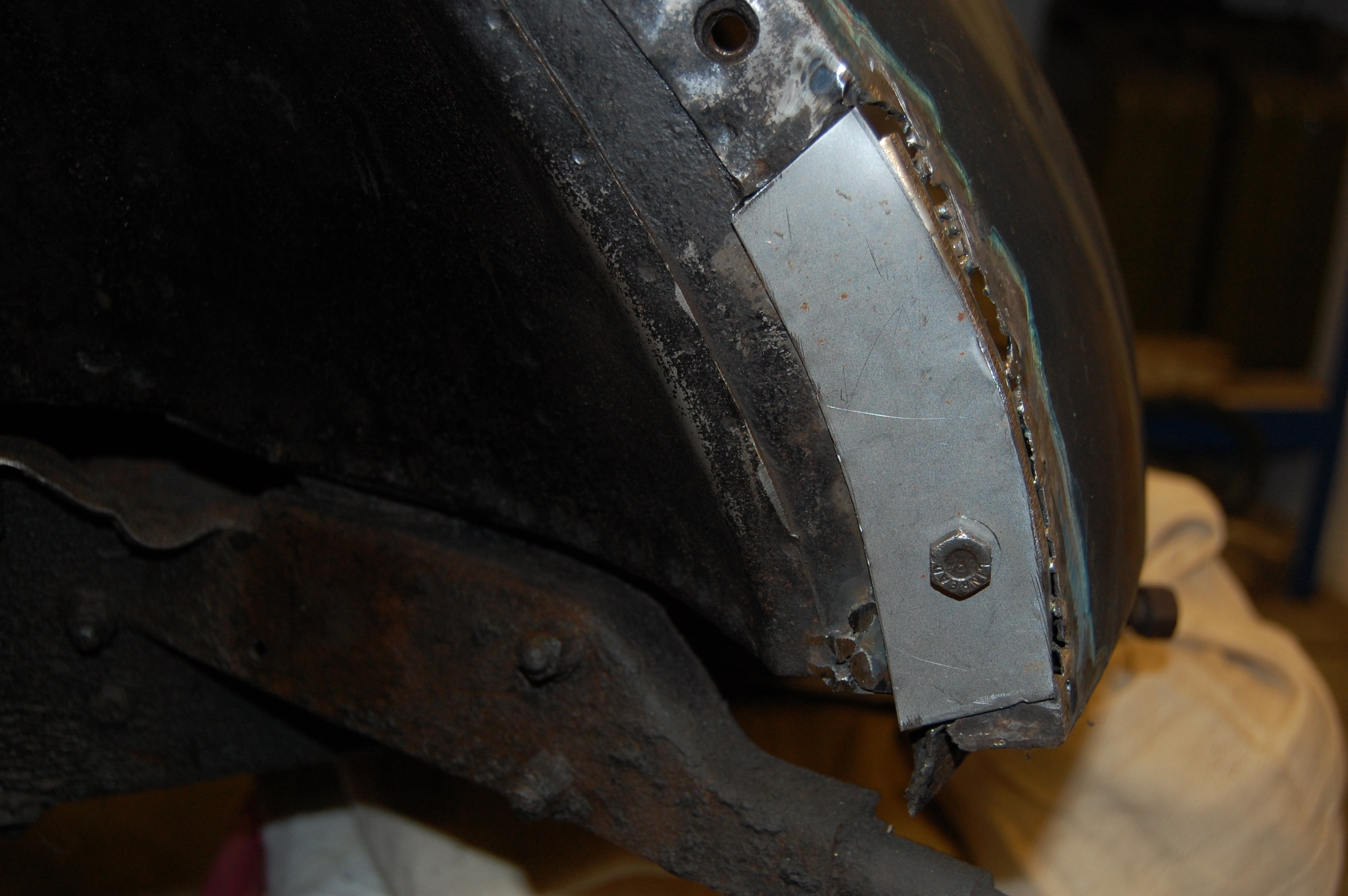 Not being an expert, the curved shape of the shroud caused me anxiety and the repair solution will not be that taken by a professional. I fabricated a backing fillet with a flange and cut-outs enabling a curve and tack welded this to the shroud face and flange, to give a solid backing for lead loading. The captive nut was welded in place ensuring it was in exactly the right position to match up to the locating hole in the wing flange. The wing was trial fitted at this stage to ensure fit.
