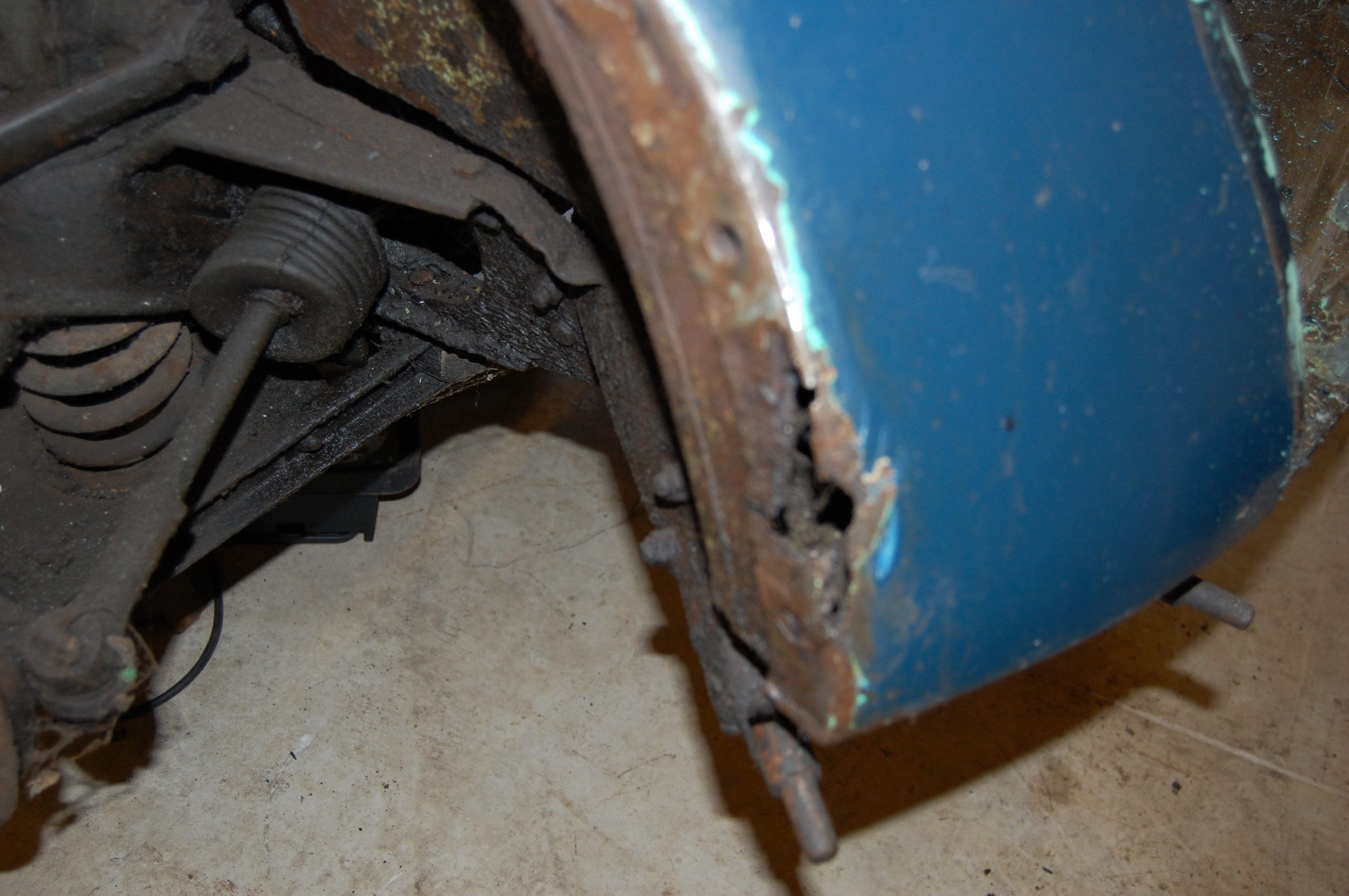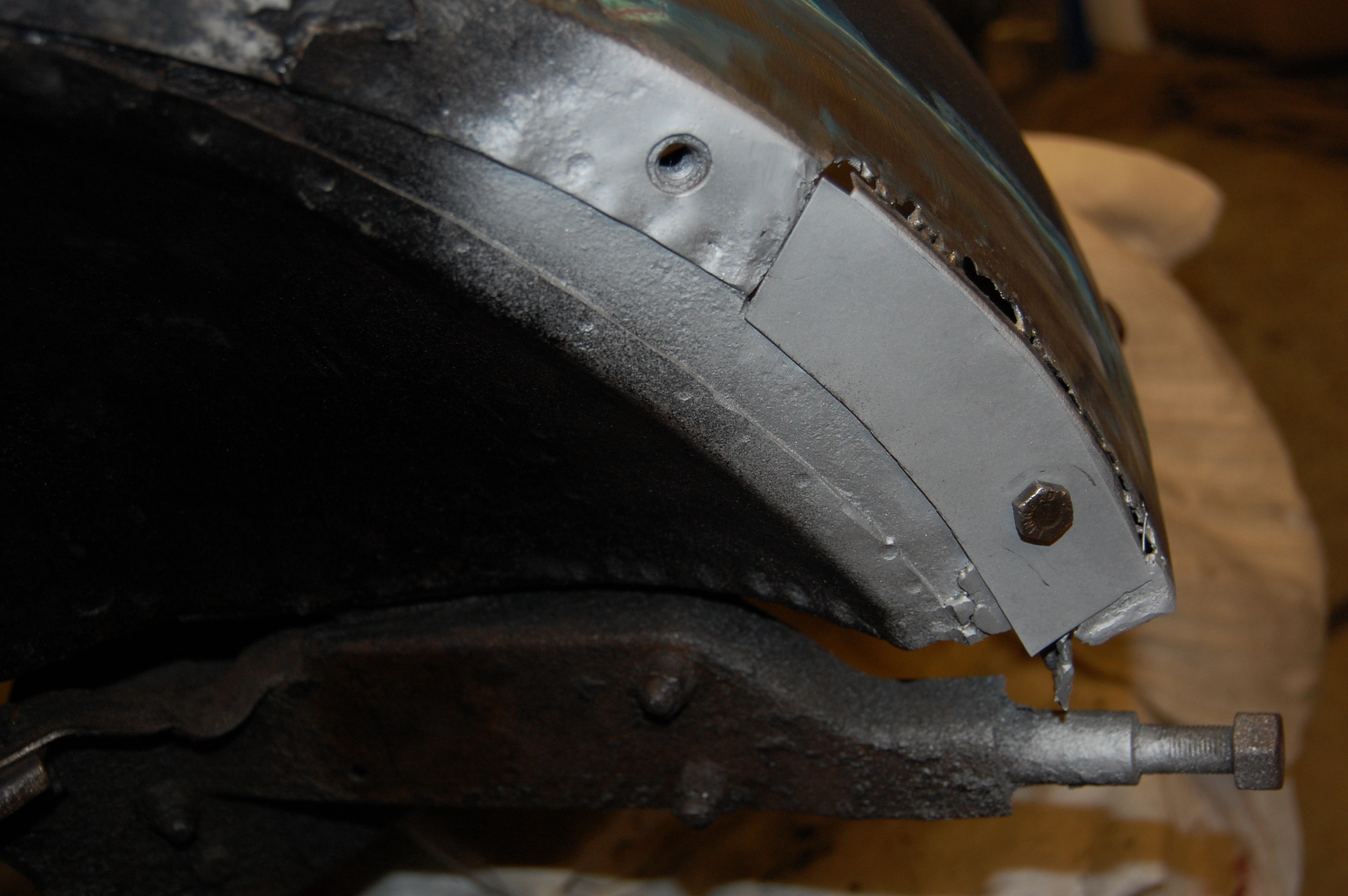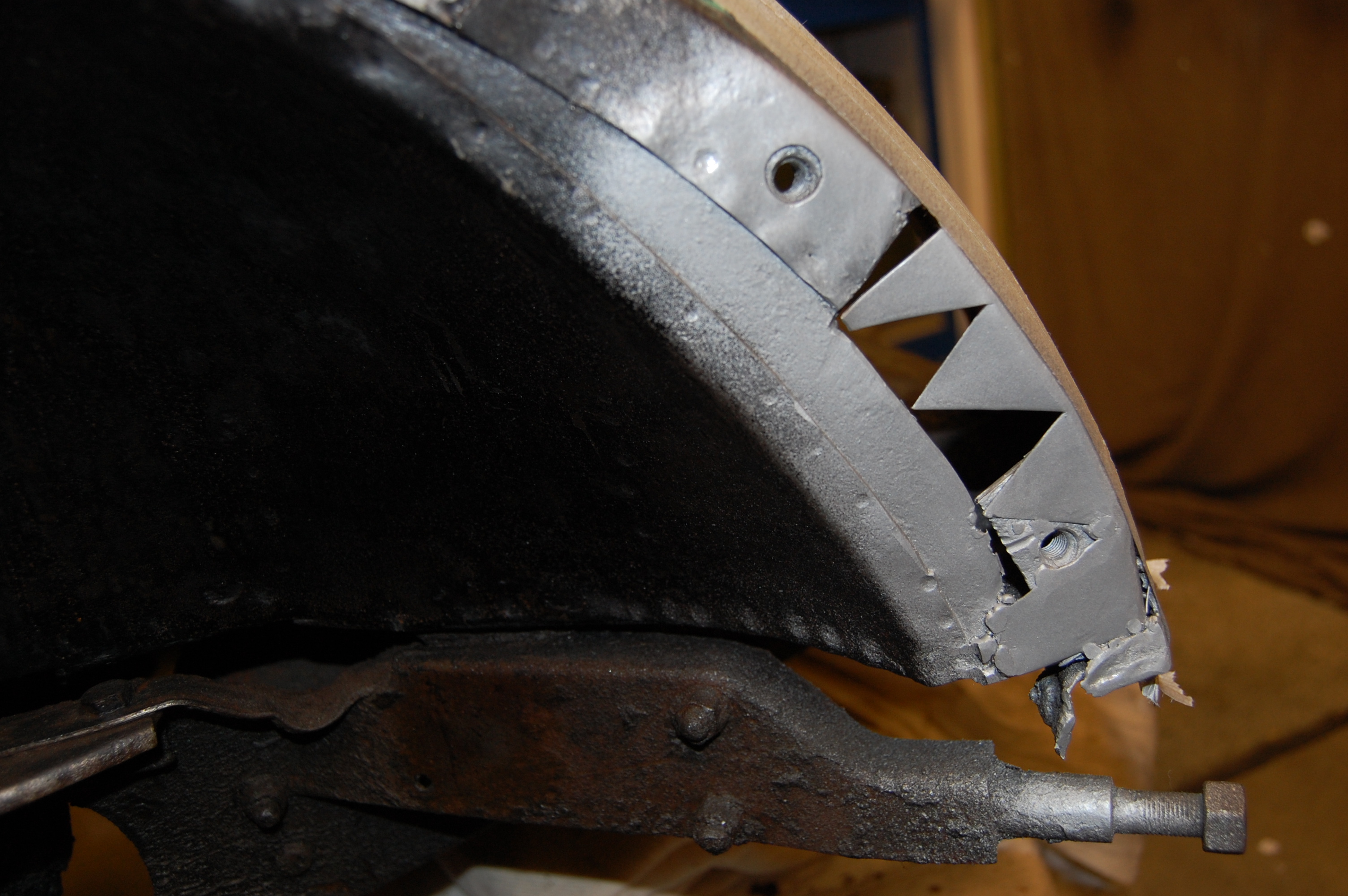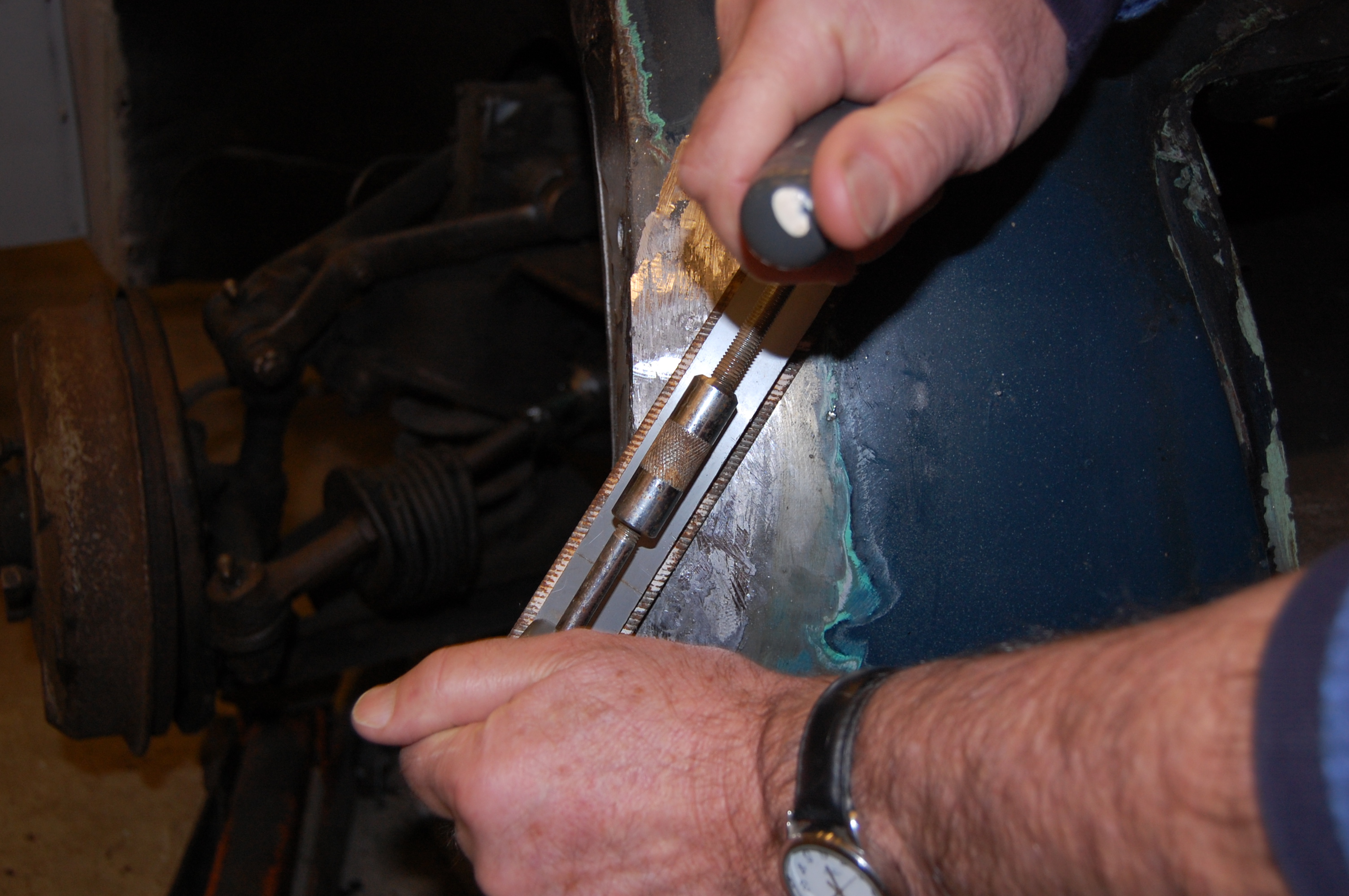 A typical area that most unrestored ‘A’s suffer often serious rust, is the flange that joins the front wings to the shroud. On my car the worst area was confined to the lower front section on both sides. I decided to cut out the rust and let in new metal, finishing the surface area on the shroud with lead loading. The following pictures describe this process.