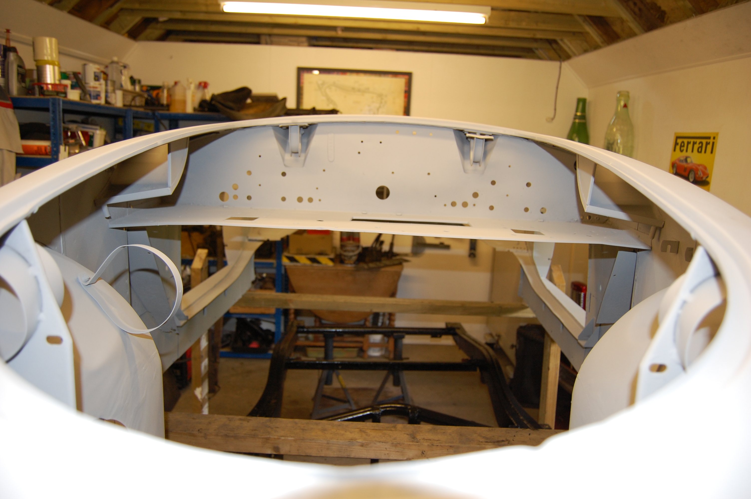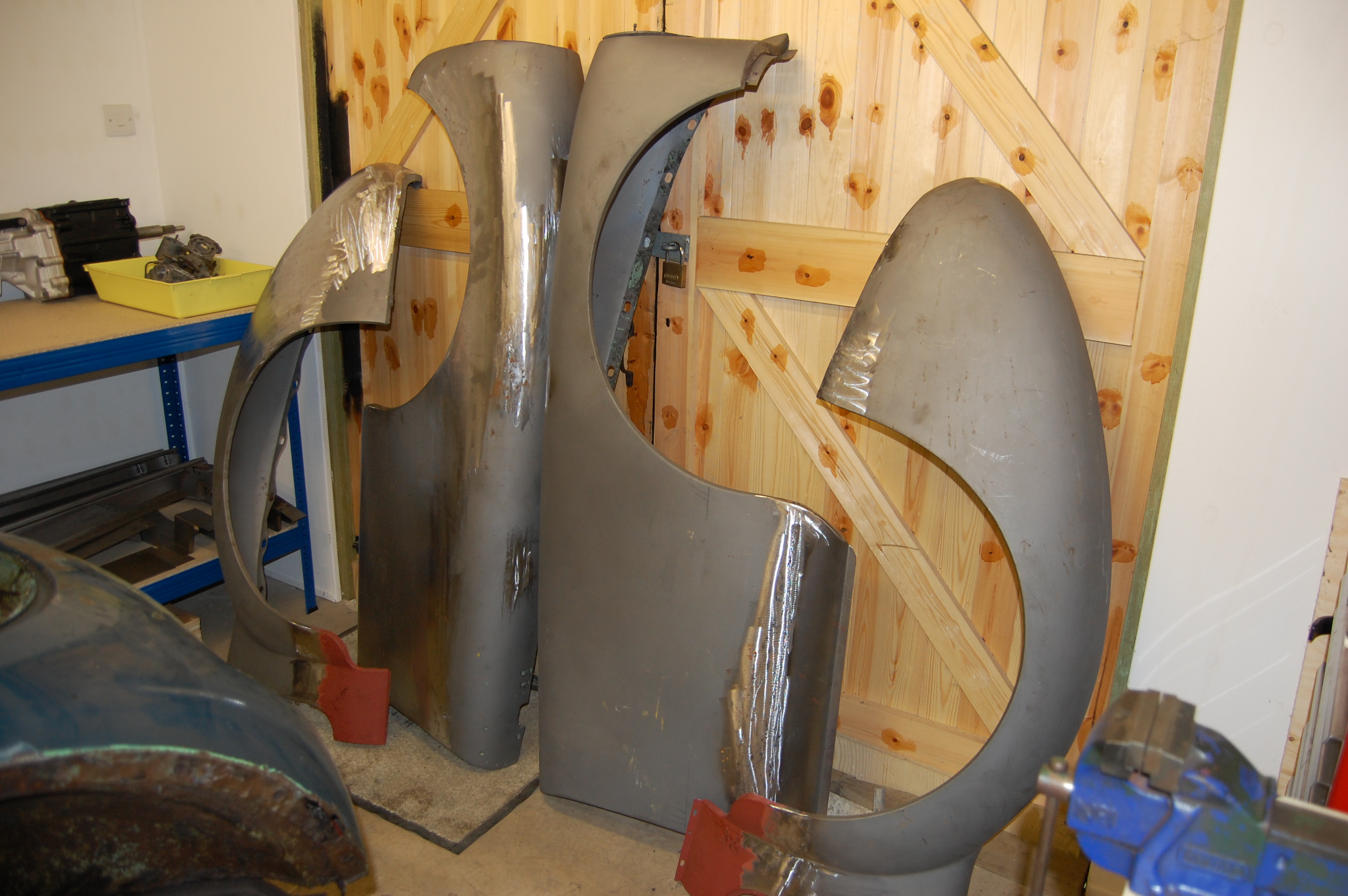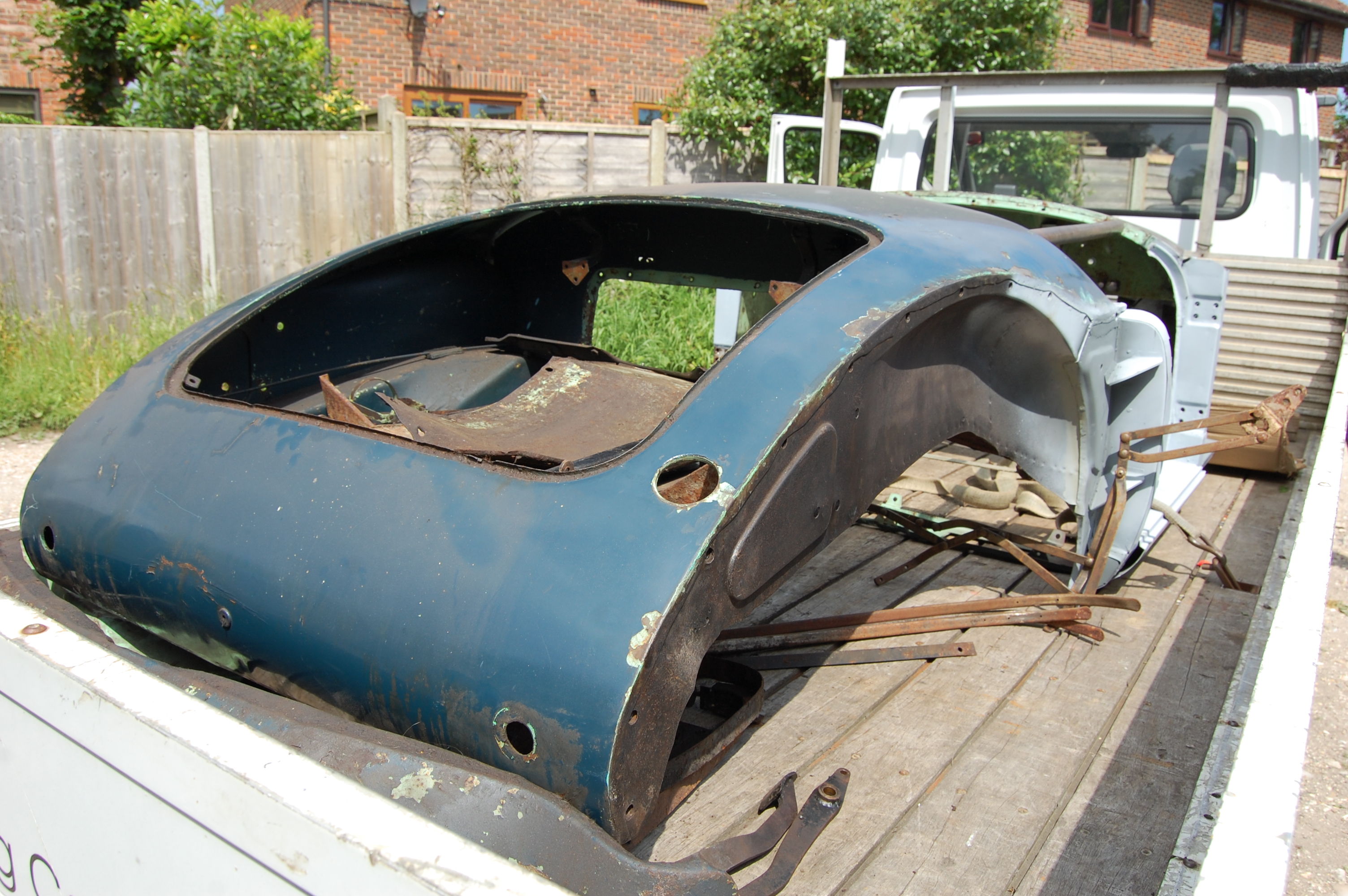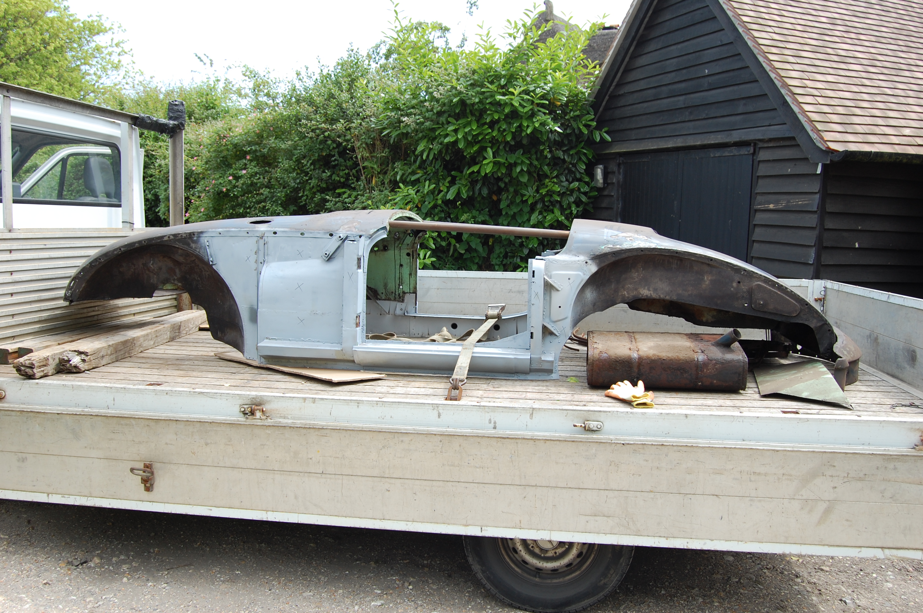 Body and all other metal body parts including hood frame, off for shot blasting. Aluminium parts – bonnet, doors and boot lid were hand stripped.