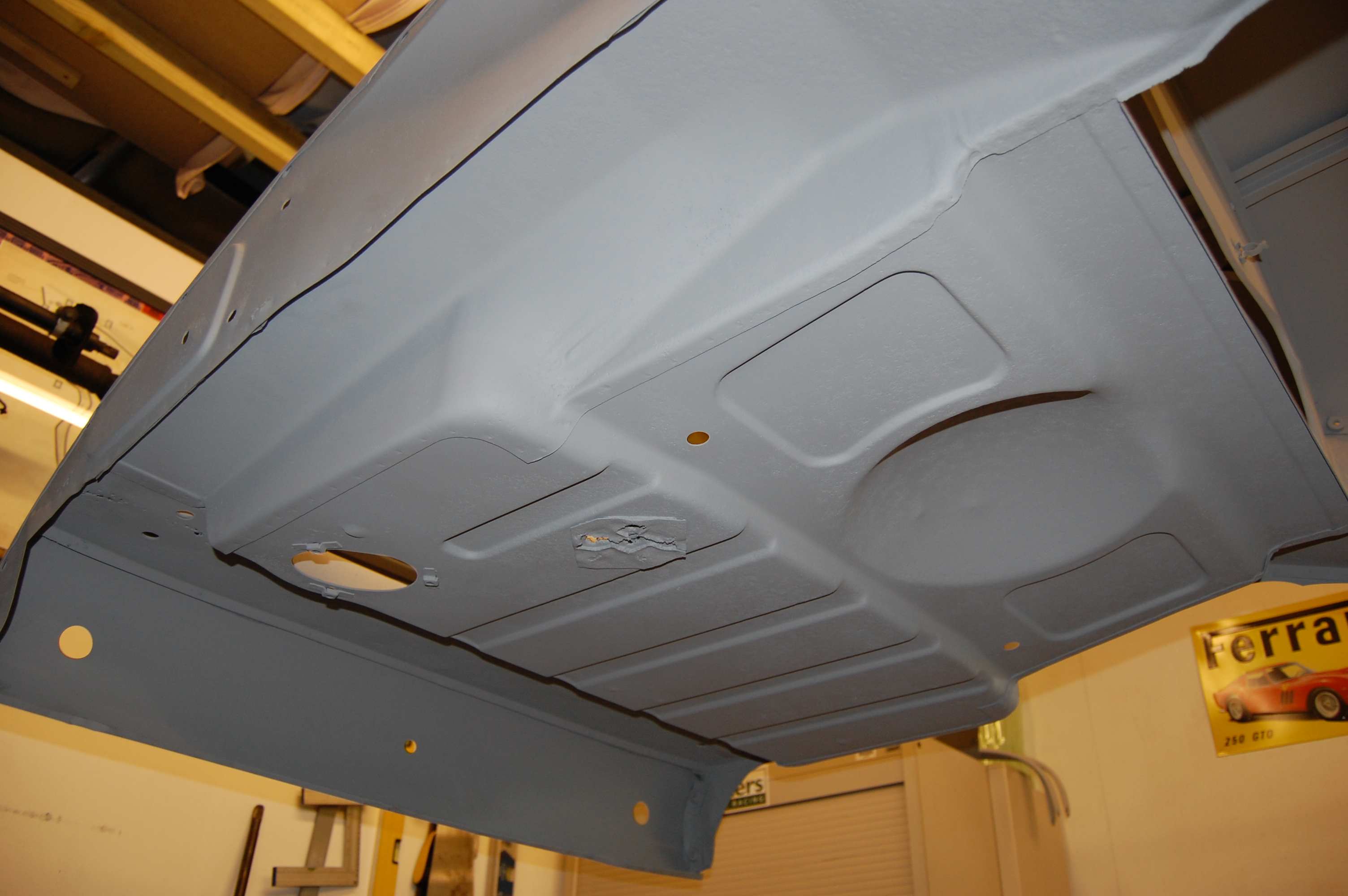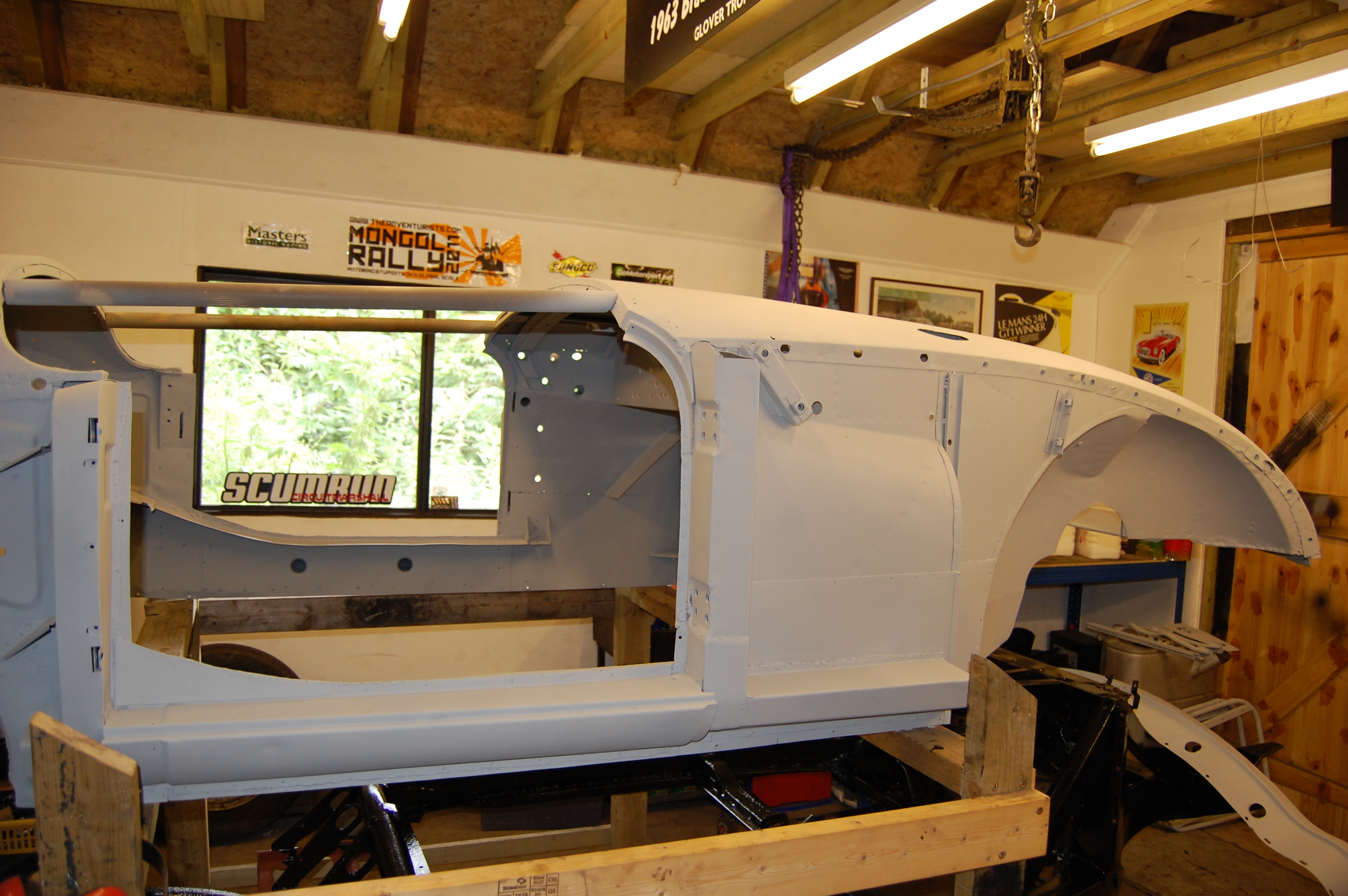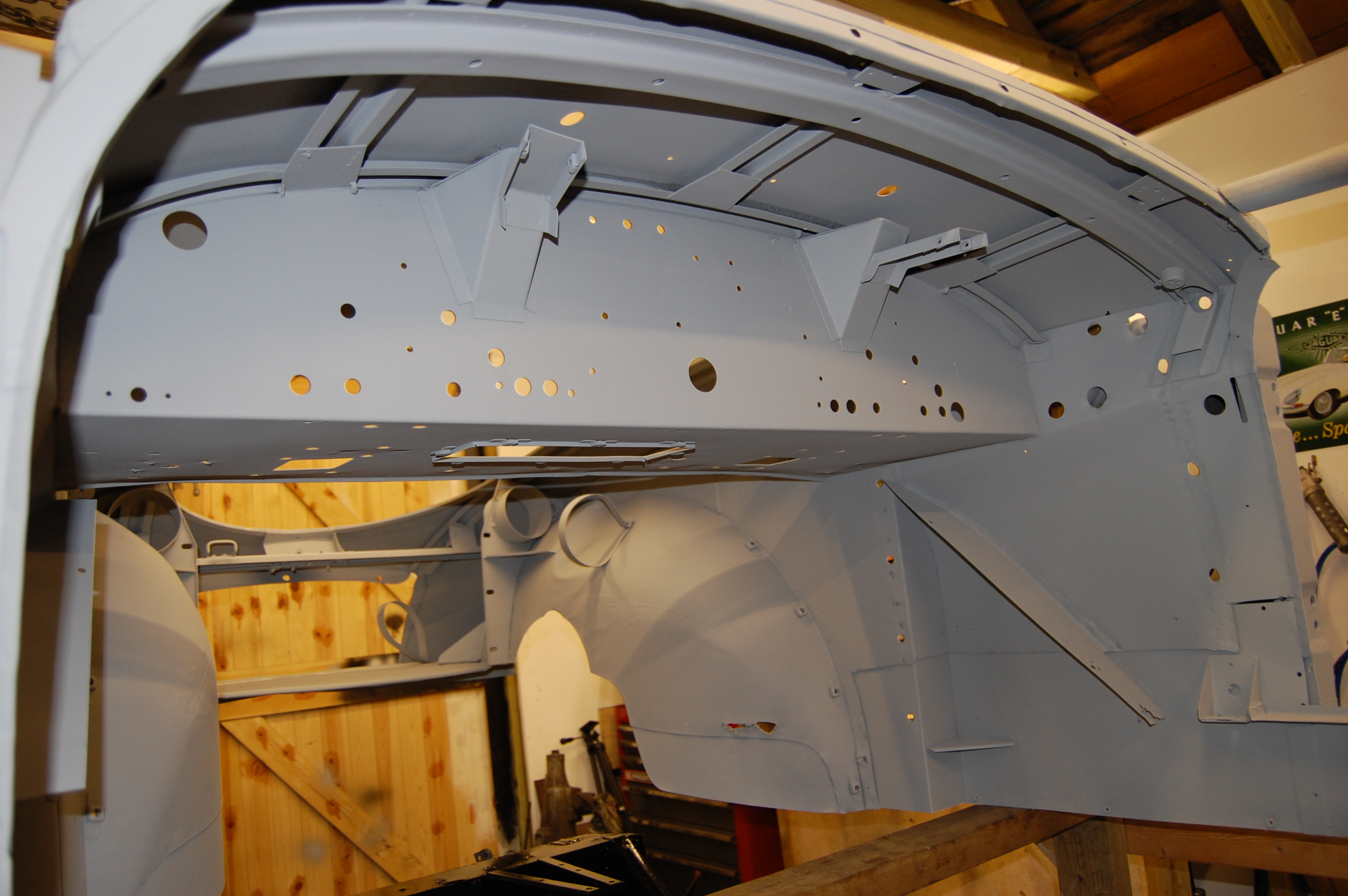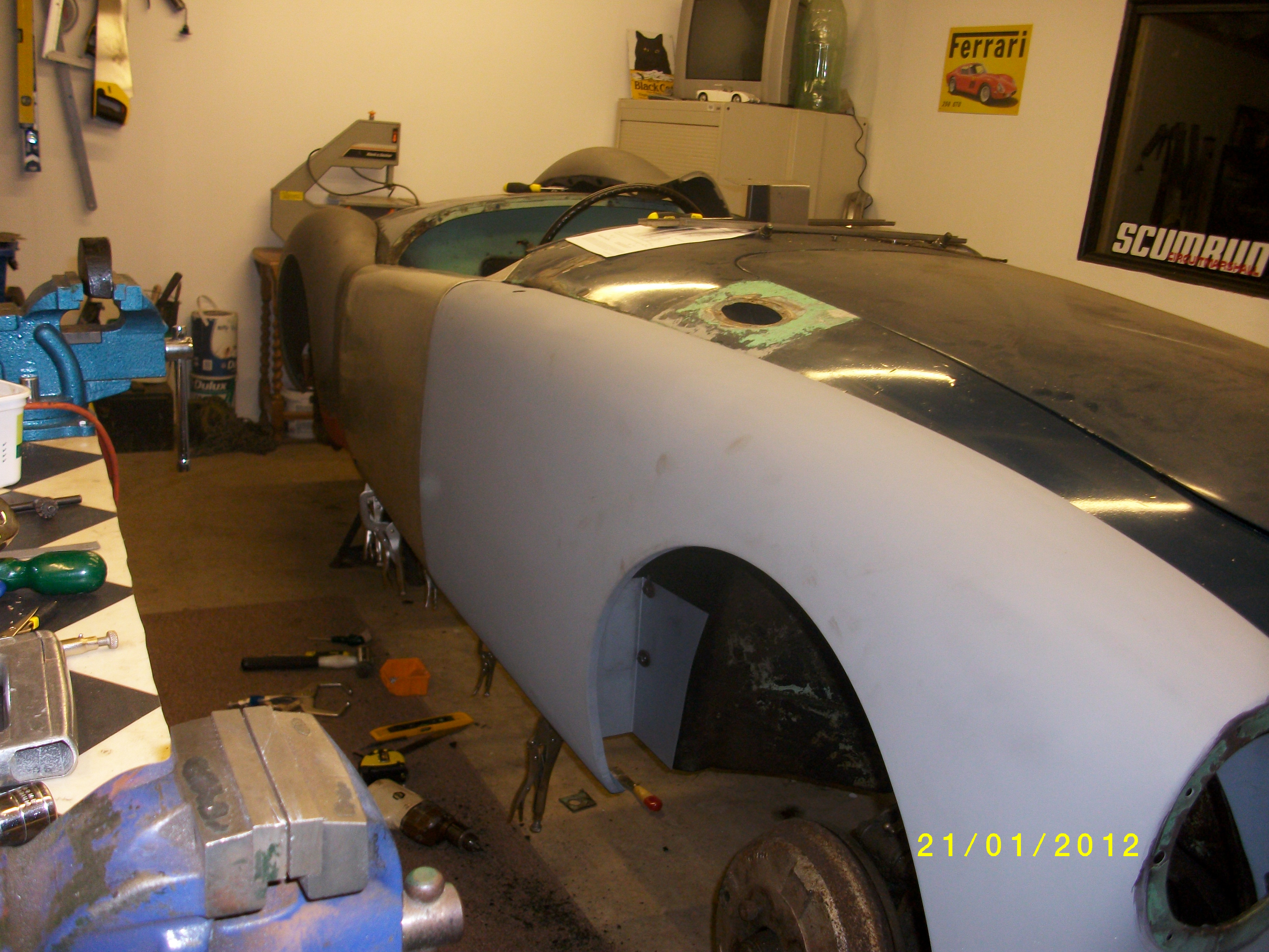 Body and all other metal body parts including hood frame, off for shot blasting. Aluminium parts – bonnet, doors and boot lid were hand stripped.