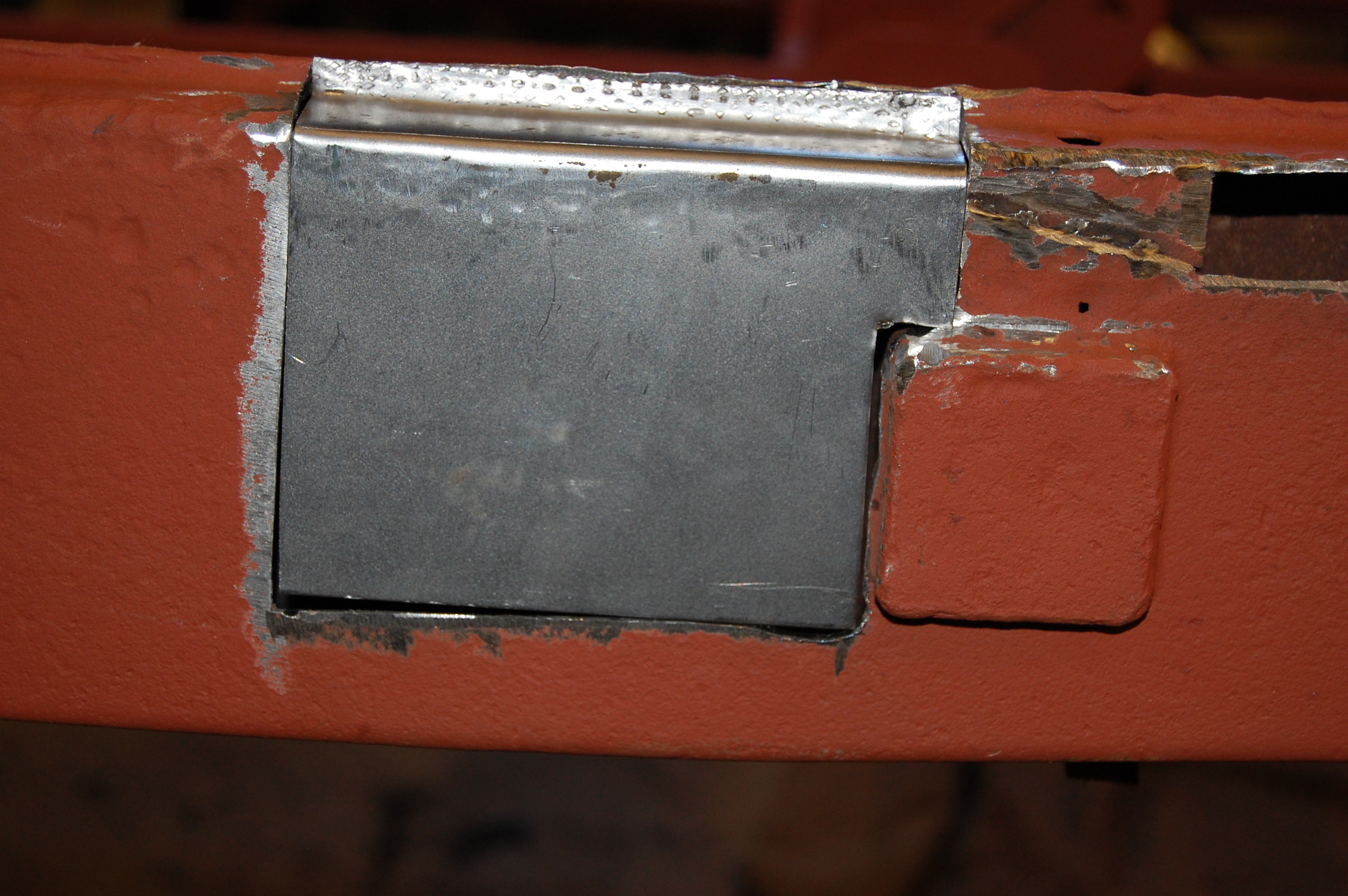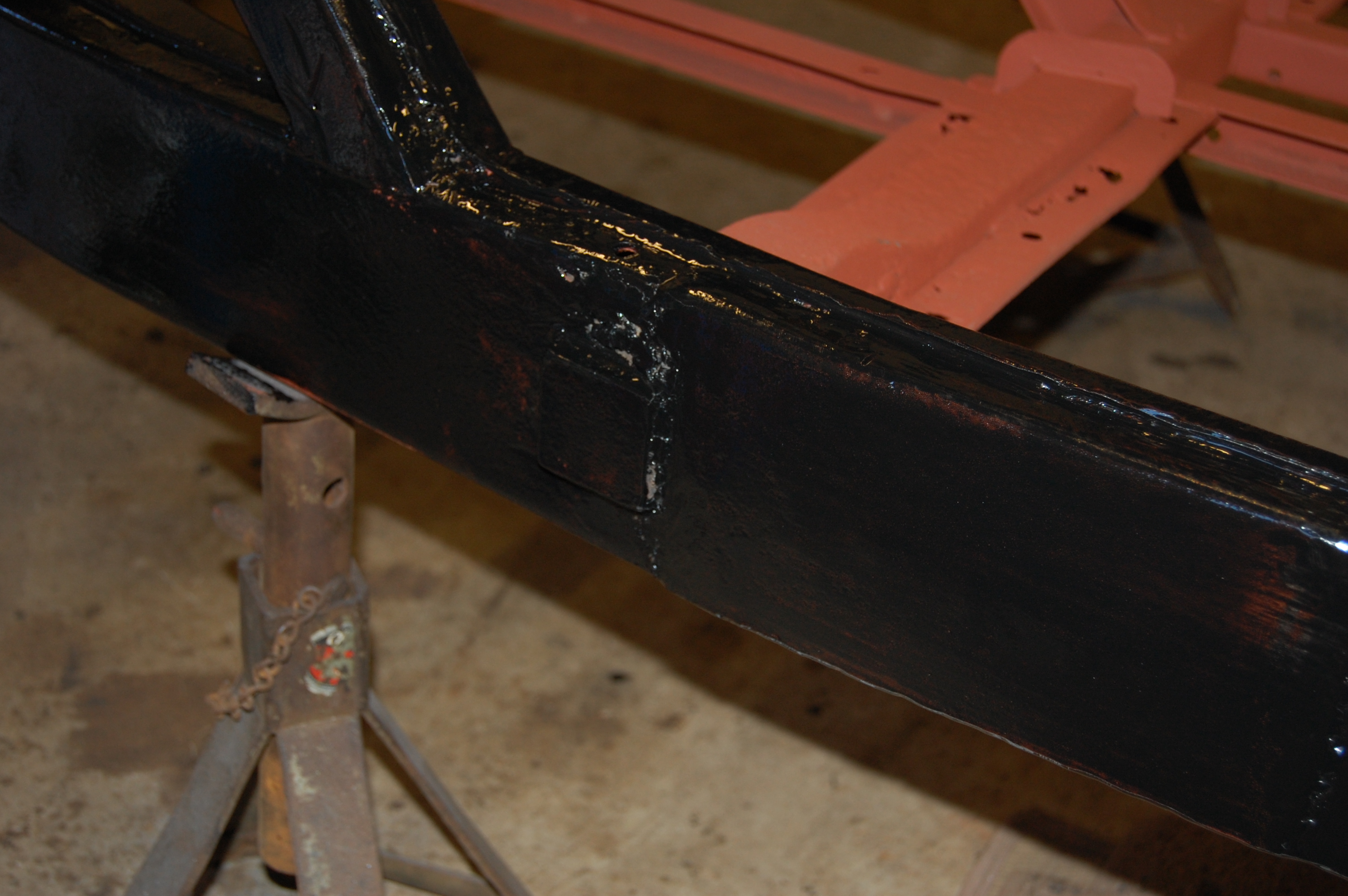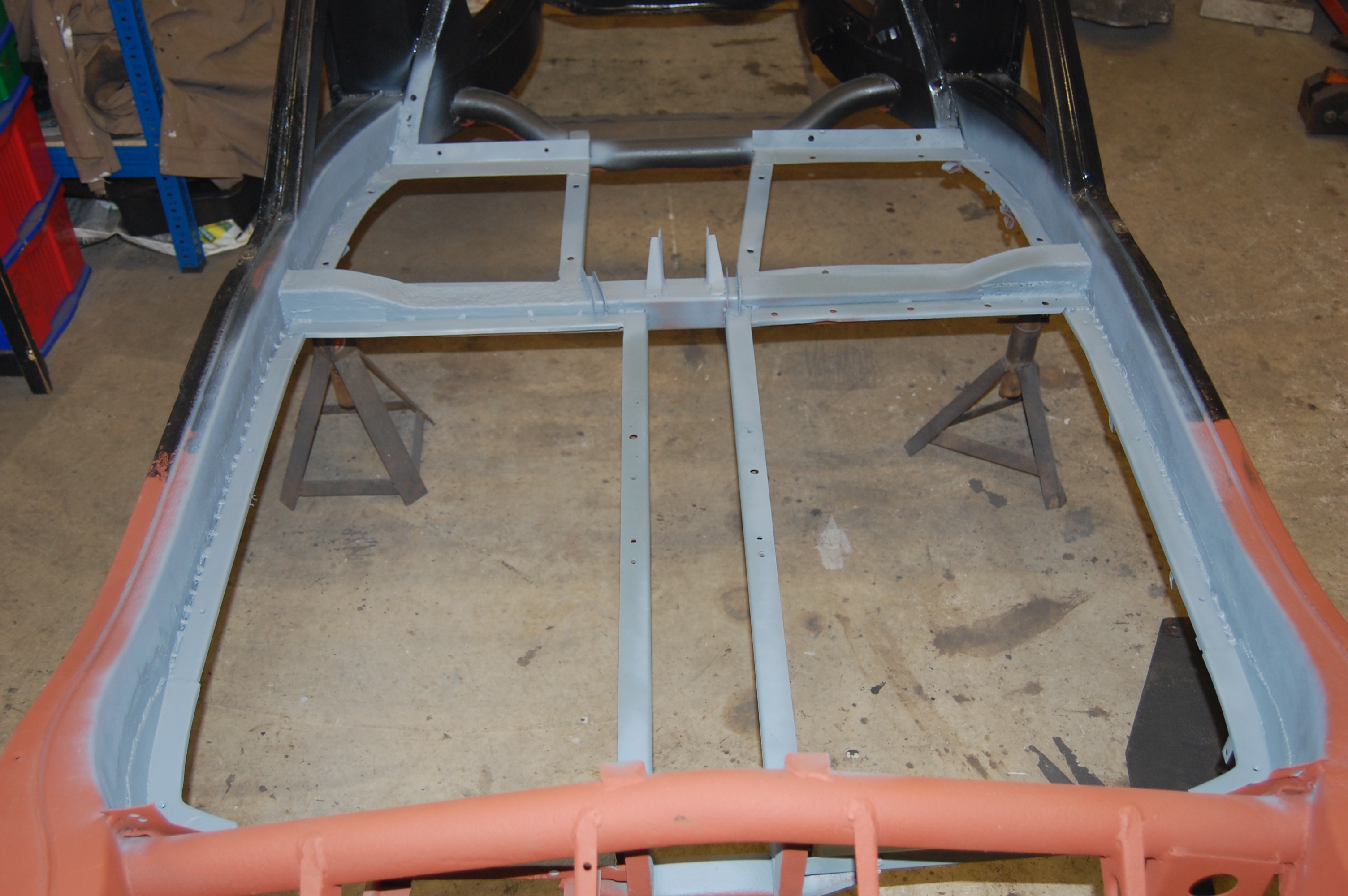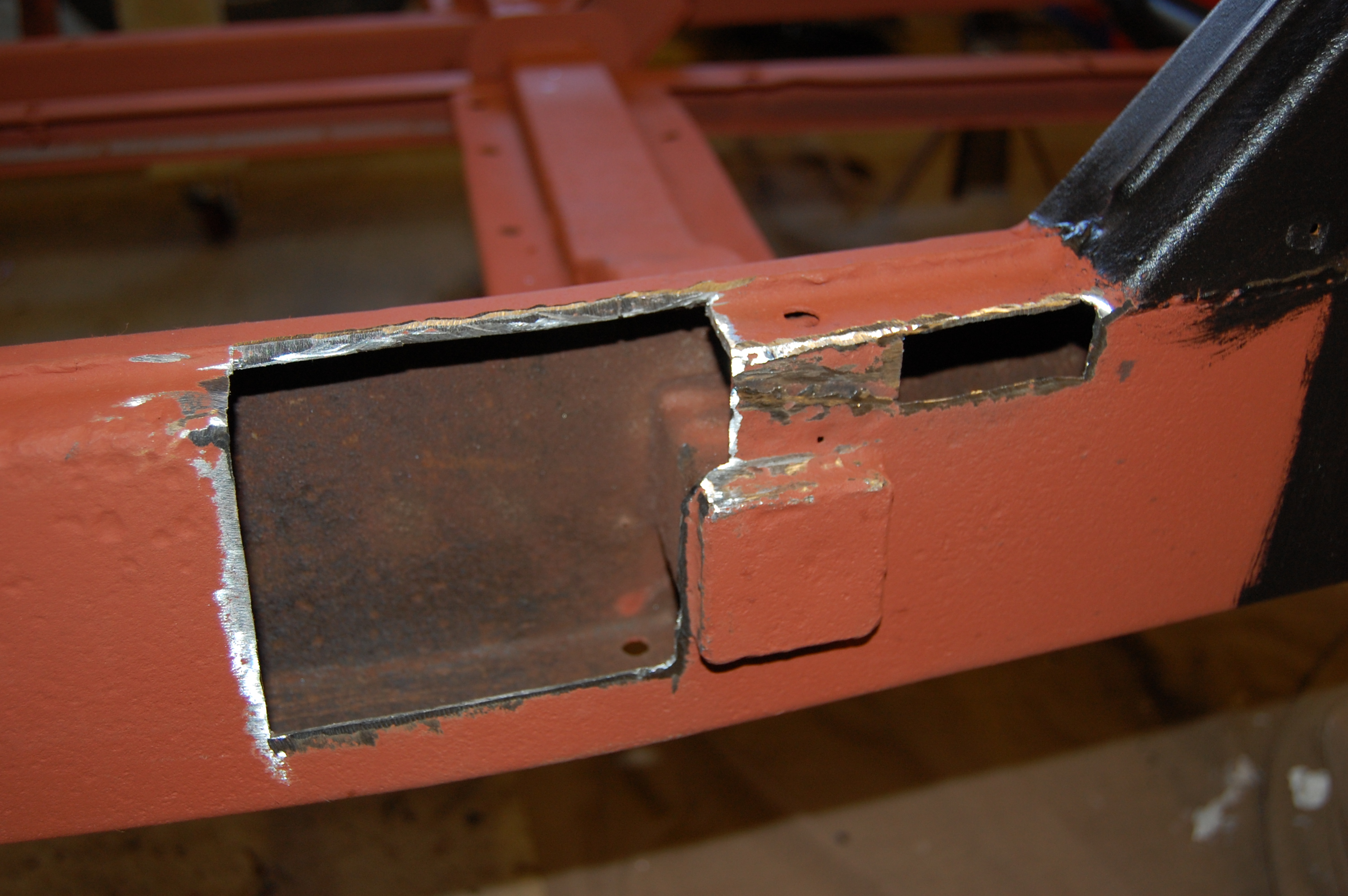 Red oxide primer ground back to leave clean metal for welding. Note how the inner surfaces are in great condition after 55 years – rust was from the outside in.