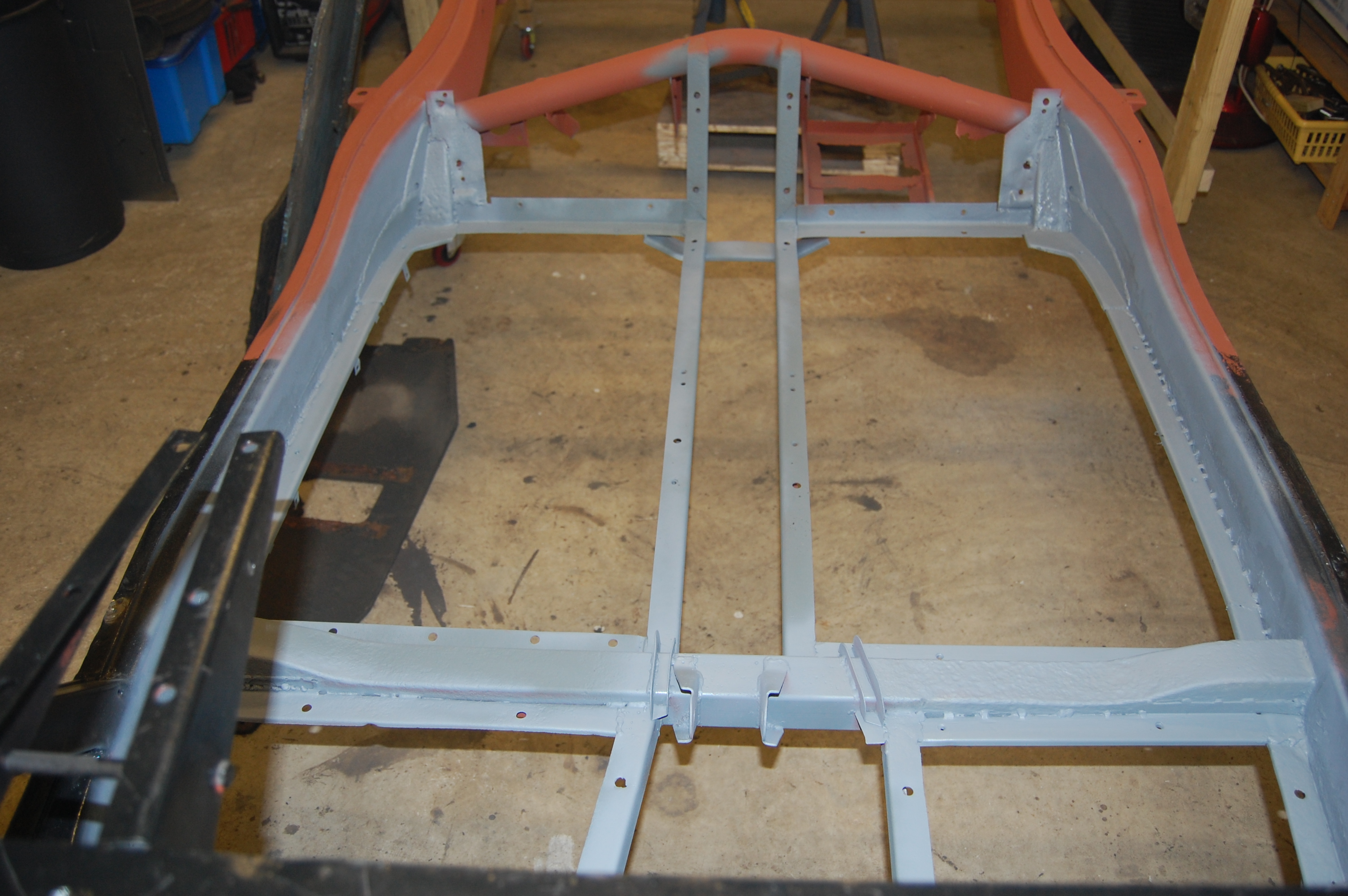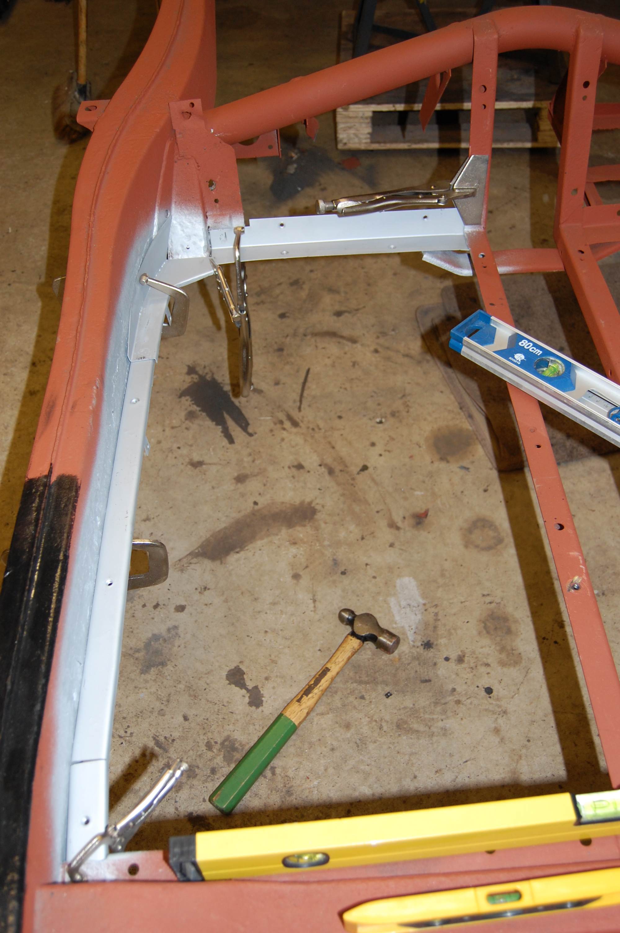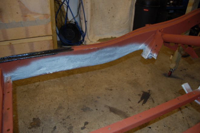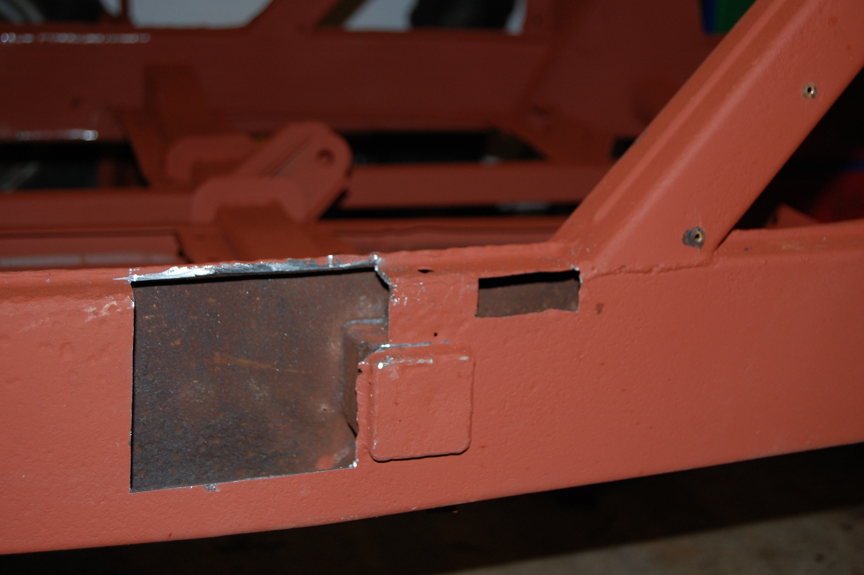 Red oxide primer ground back to leave clean metal for welding. Note how the inner surfaces are in great condition after 55 years – rust was from the outside in.