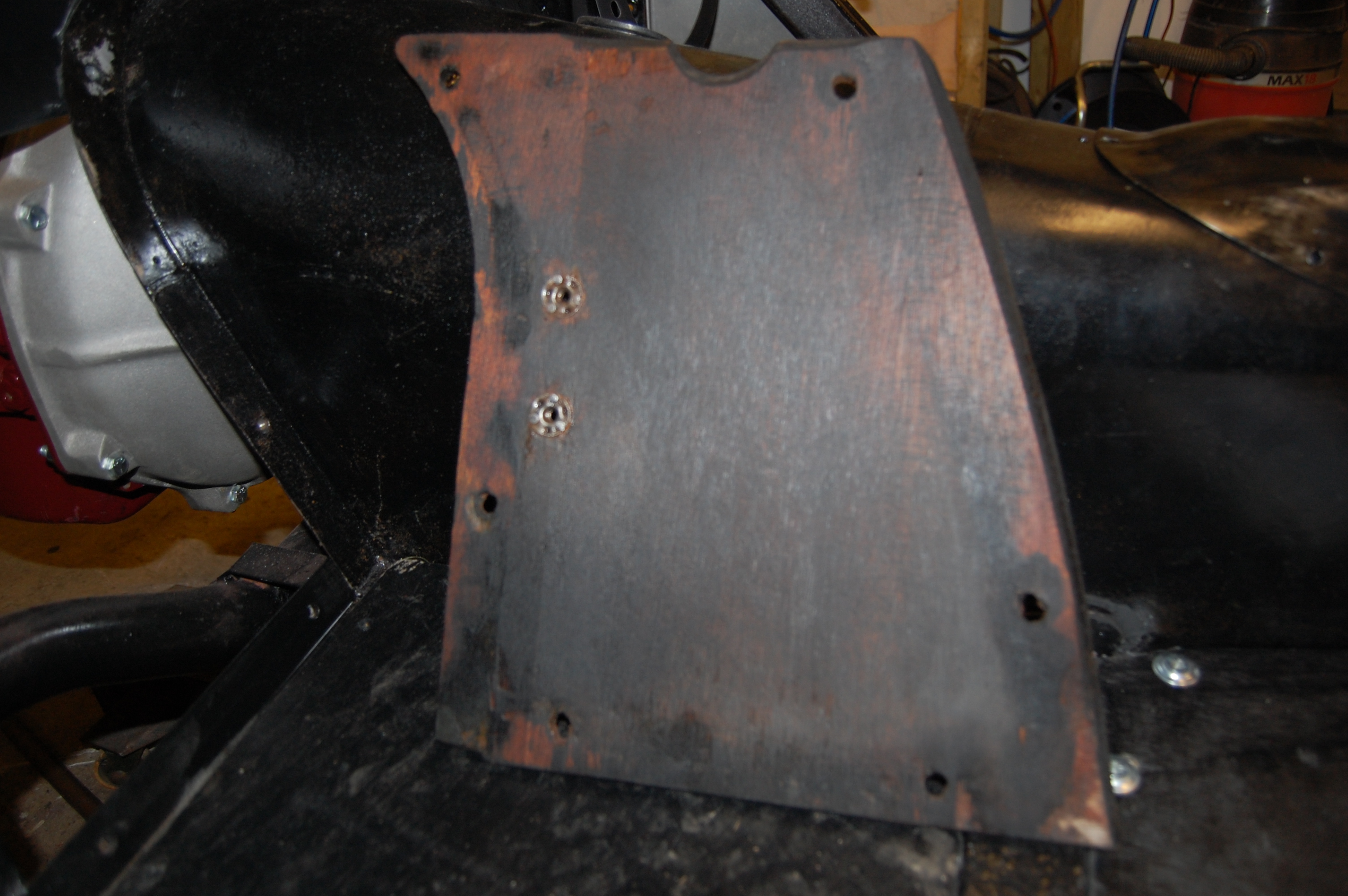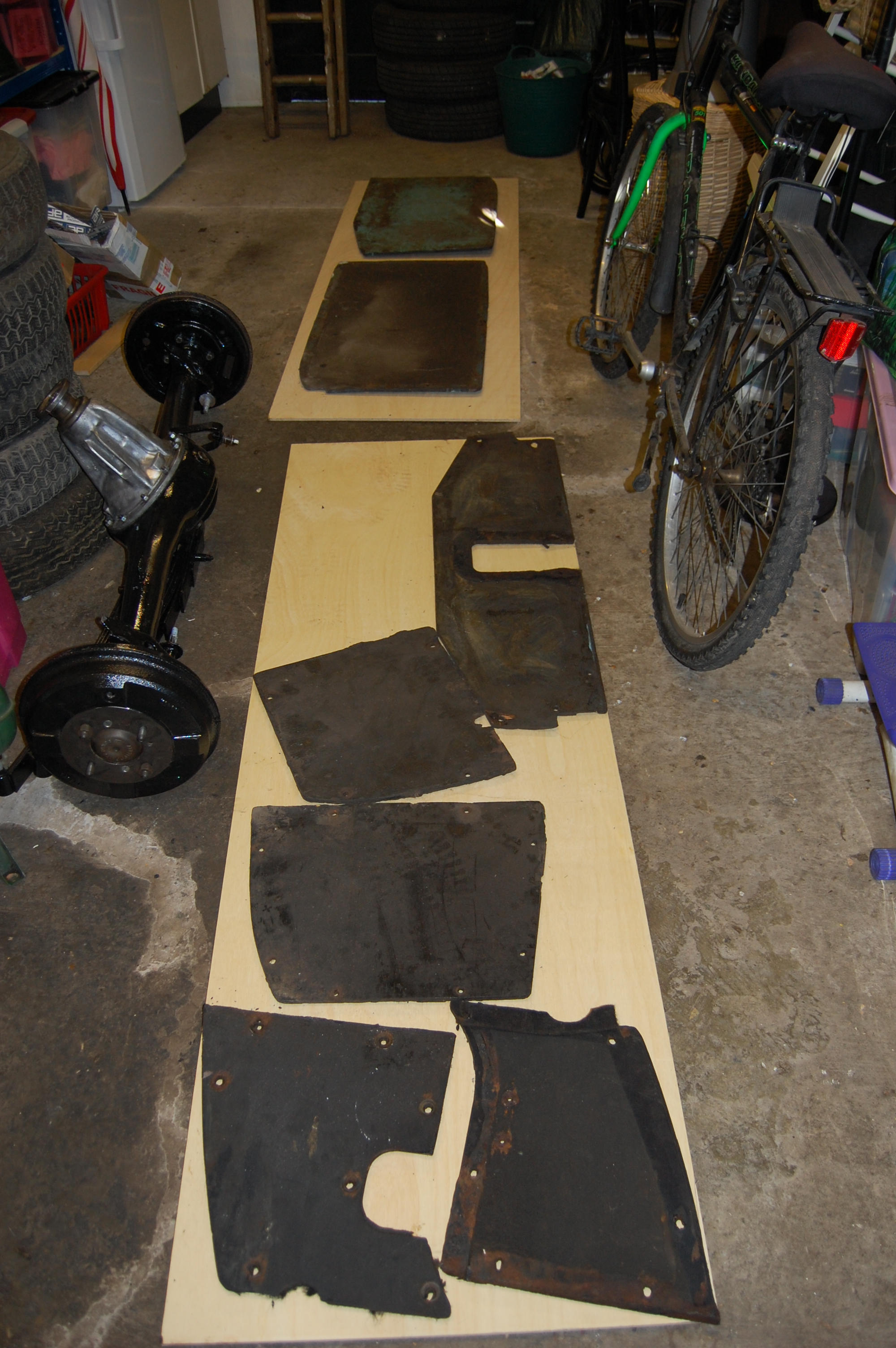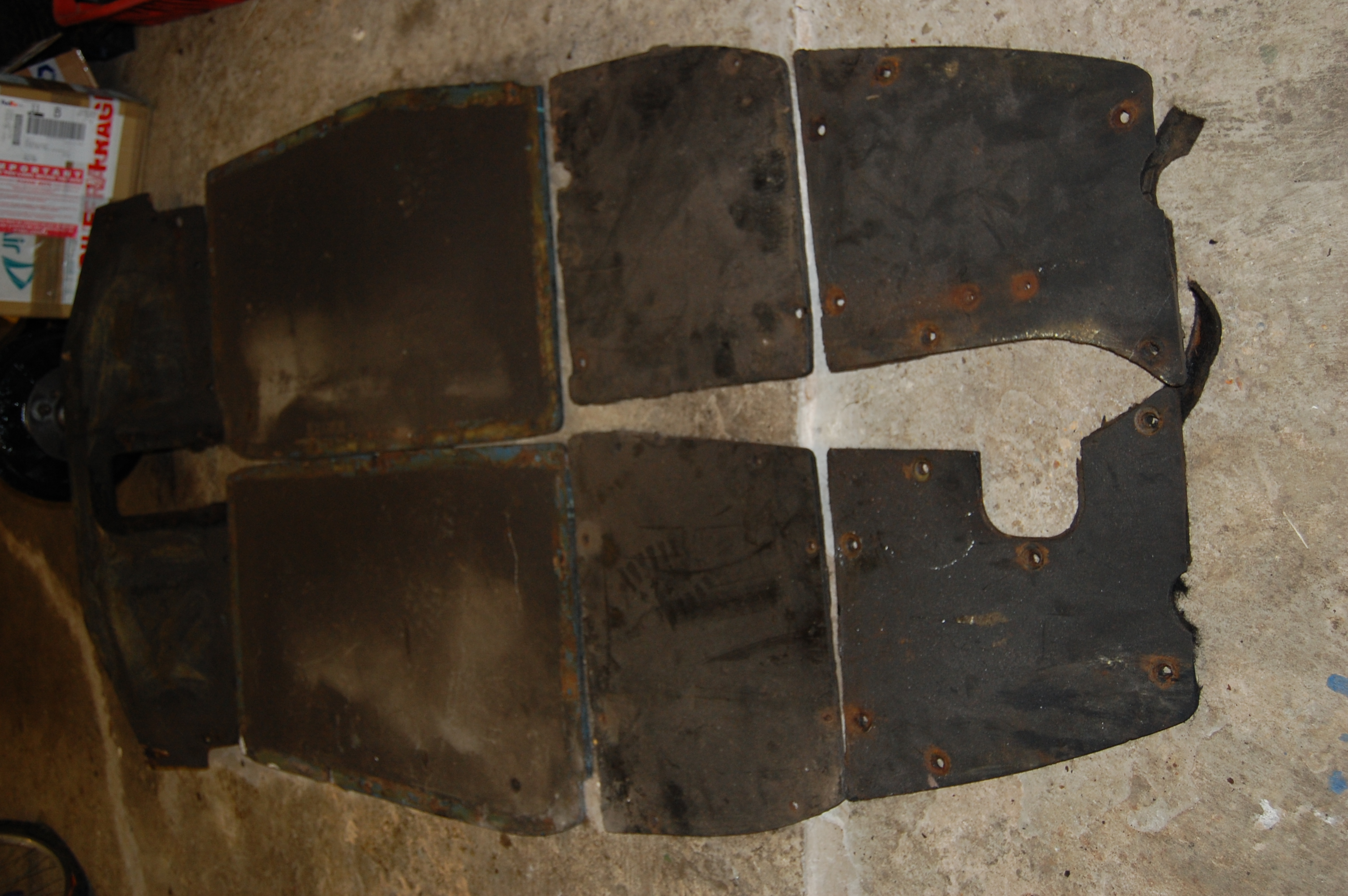 I had an incident when the car was in use during the 70’s, when I hit a small flood at around 60 mph, which caused the trailing edge of the passengers front floorboard to burst, throwing the carpets up and filling the car with a mixture of foul water and leaves – I was also plastered and arrived at my girlfriends soaked in a wild state! Best then to make sure of the fit and fixings of the boards.The offending board is the top second from right showing the chunk missing where the bolt tore away.