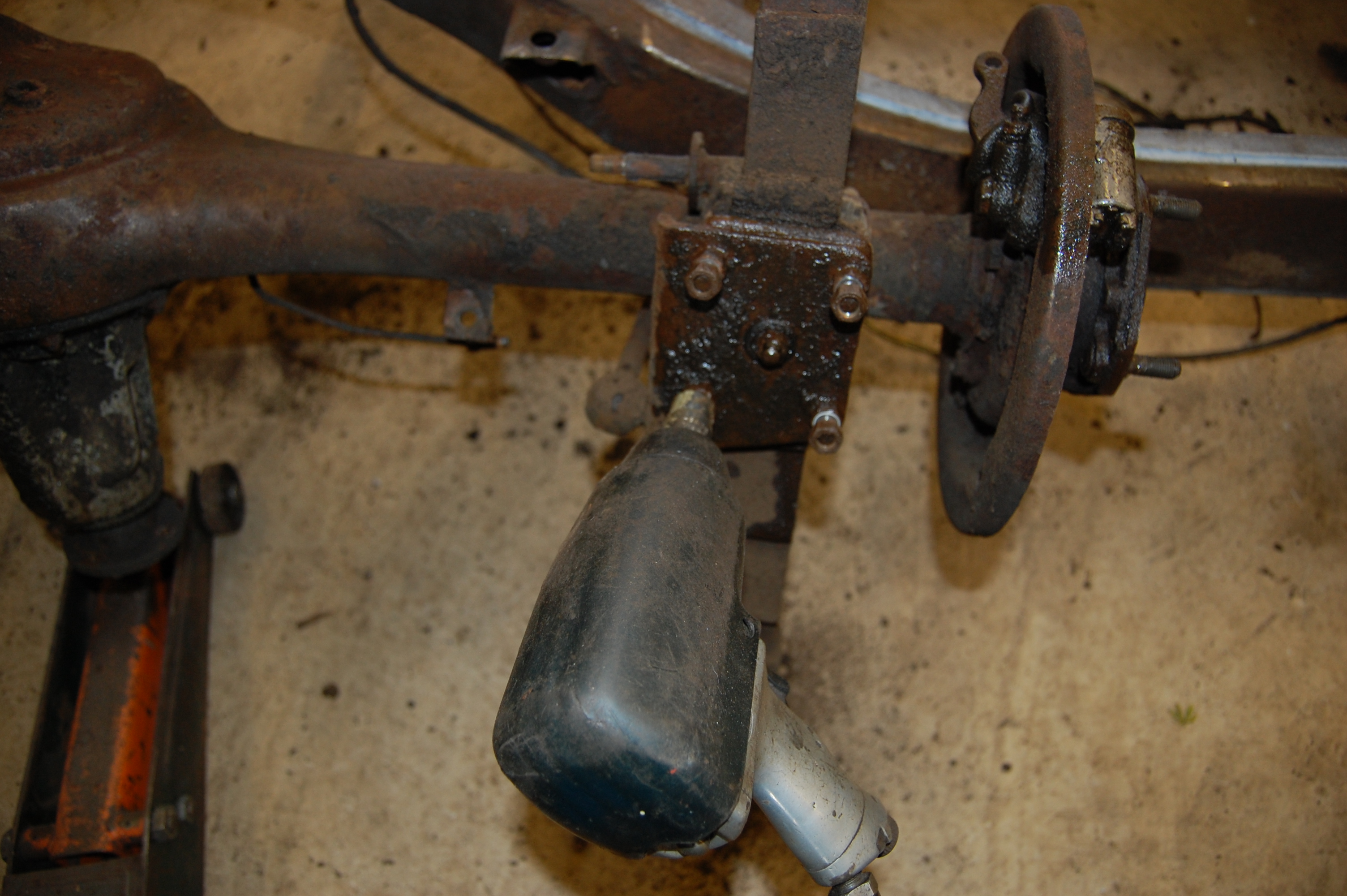 A good air gun is a big help in releasing the various suspension bolts that are unwilling to give up after 55 years. It’s much easier to remove the rear springs from the axle once it’s removed from the car. Remarkably, I only had to resort to the grinder for one bolt, which was the front left hand spring hanger bolt. All others eventually gave in to copious application of WD40 and grunt.