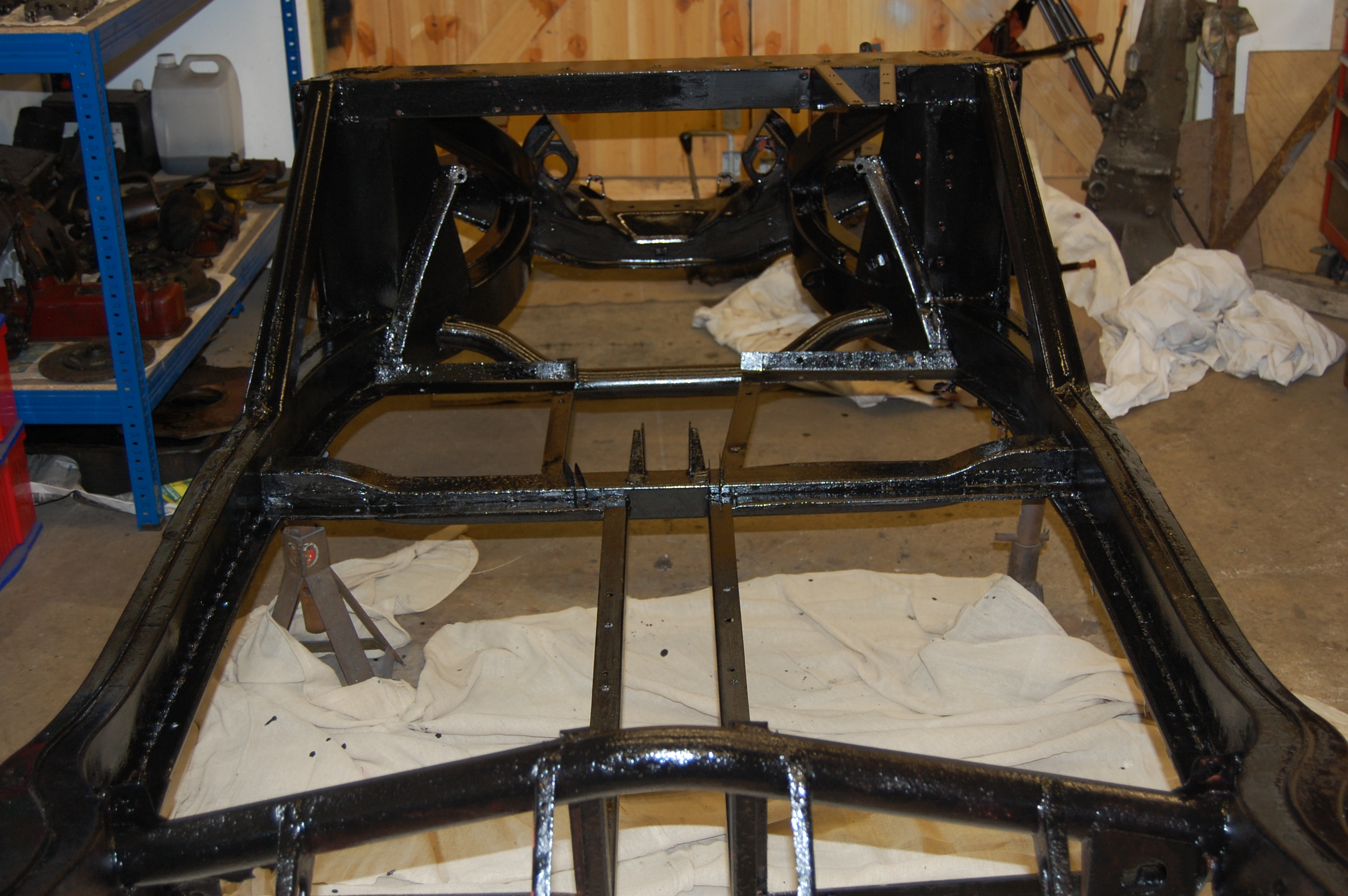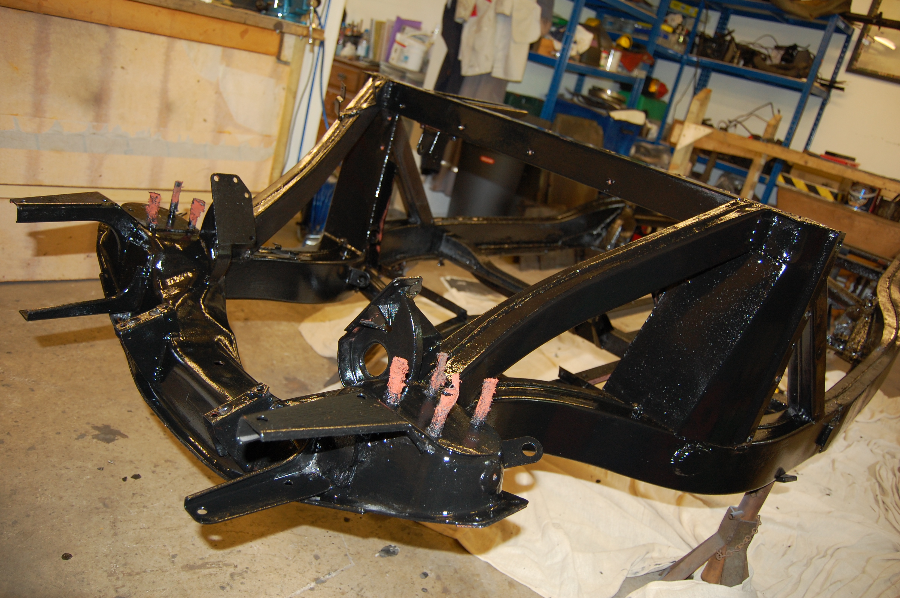 Chassis returned from shot blasting – nothing found more than was already obvious. If local to Chichester, I recommend Penfold Metalising in Barnham. Great service and a good price (£98). Only problem was that the black chassis paint that I’d purchased reacted with the oxide primer. I tried Hammerite smooth, but that reacted in the same way I finally settled on Blackfriar Satin Black, which is a great paint, but blows your mind if not well ventilated and a good respirator used.
