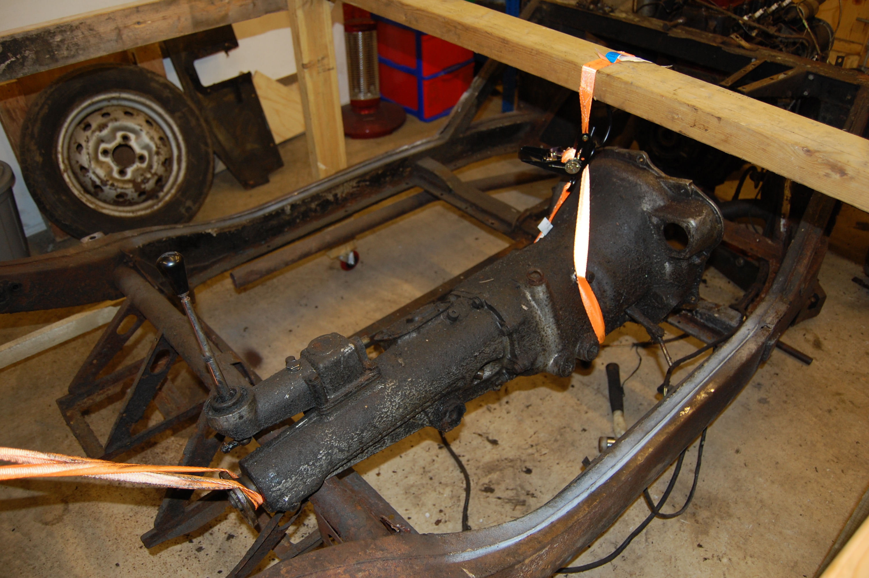 The body at this point was away being shot blasted, so the dolly was there and seemed a good prop to aid single-handed gearbox removal.
