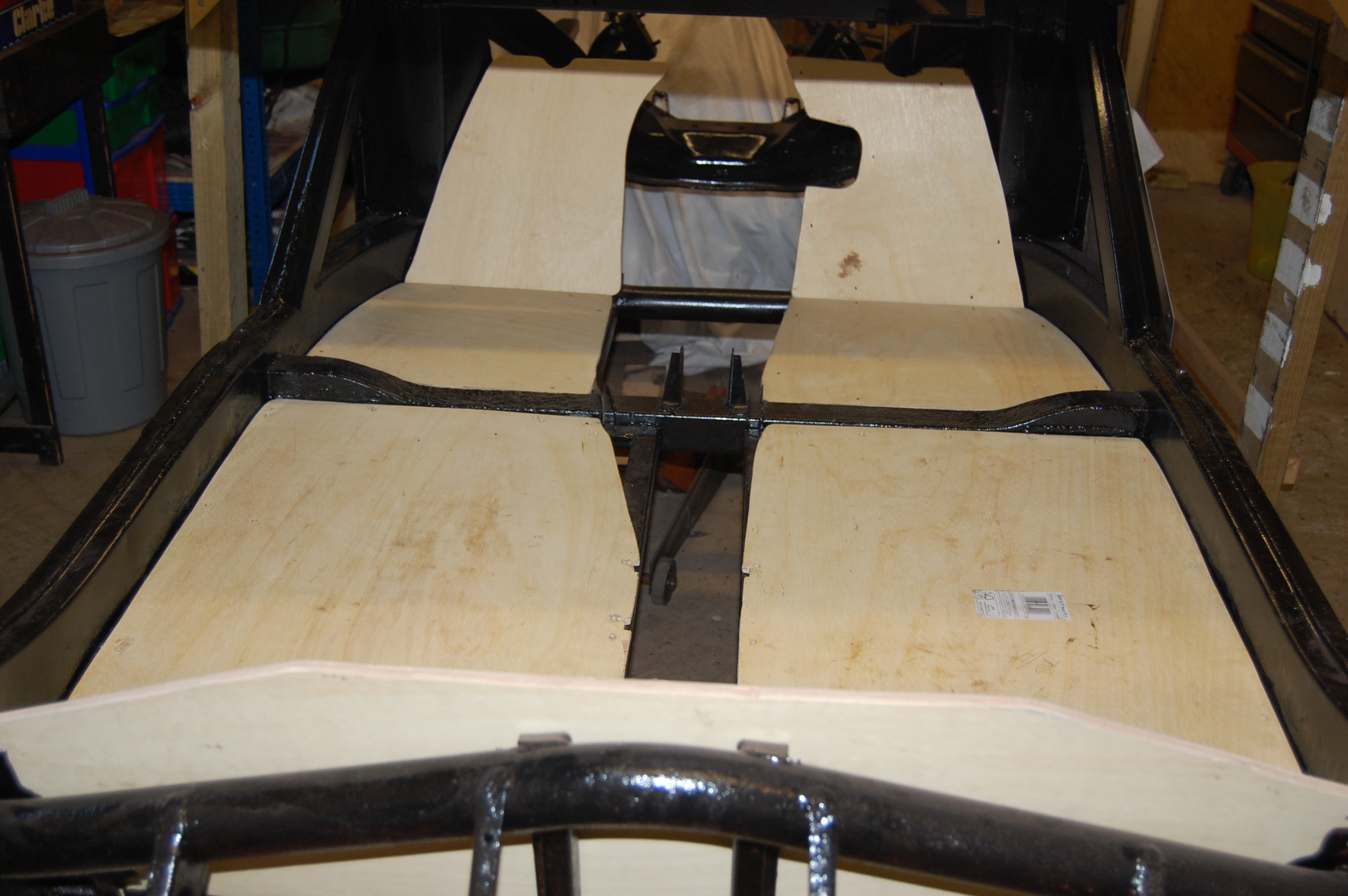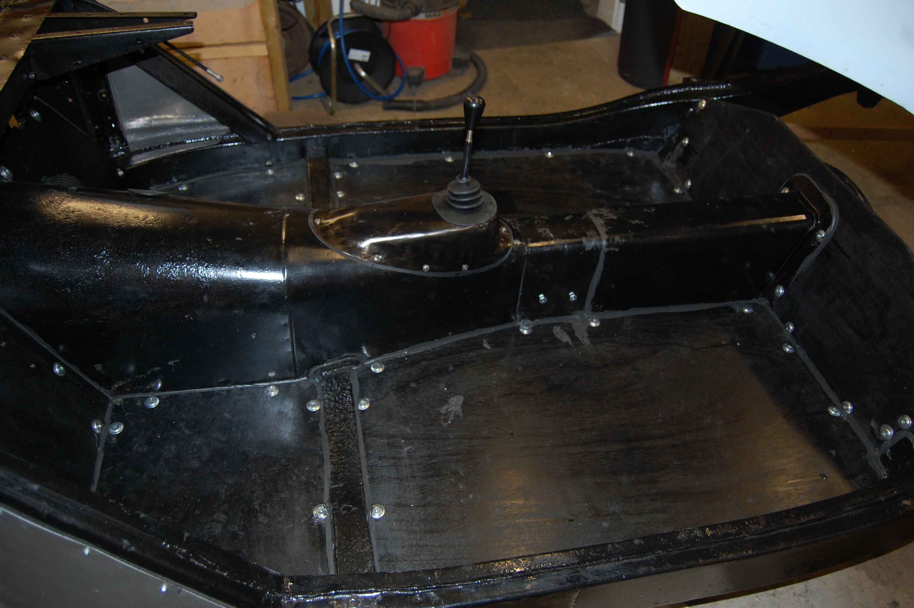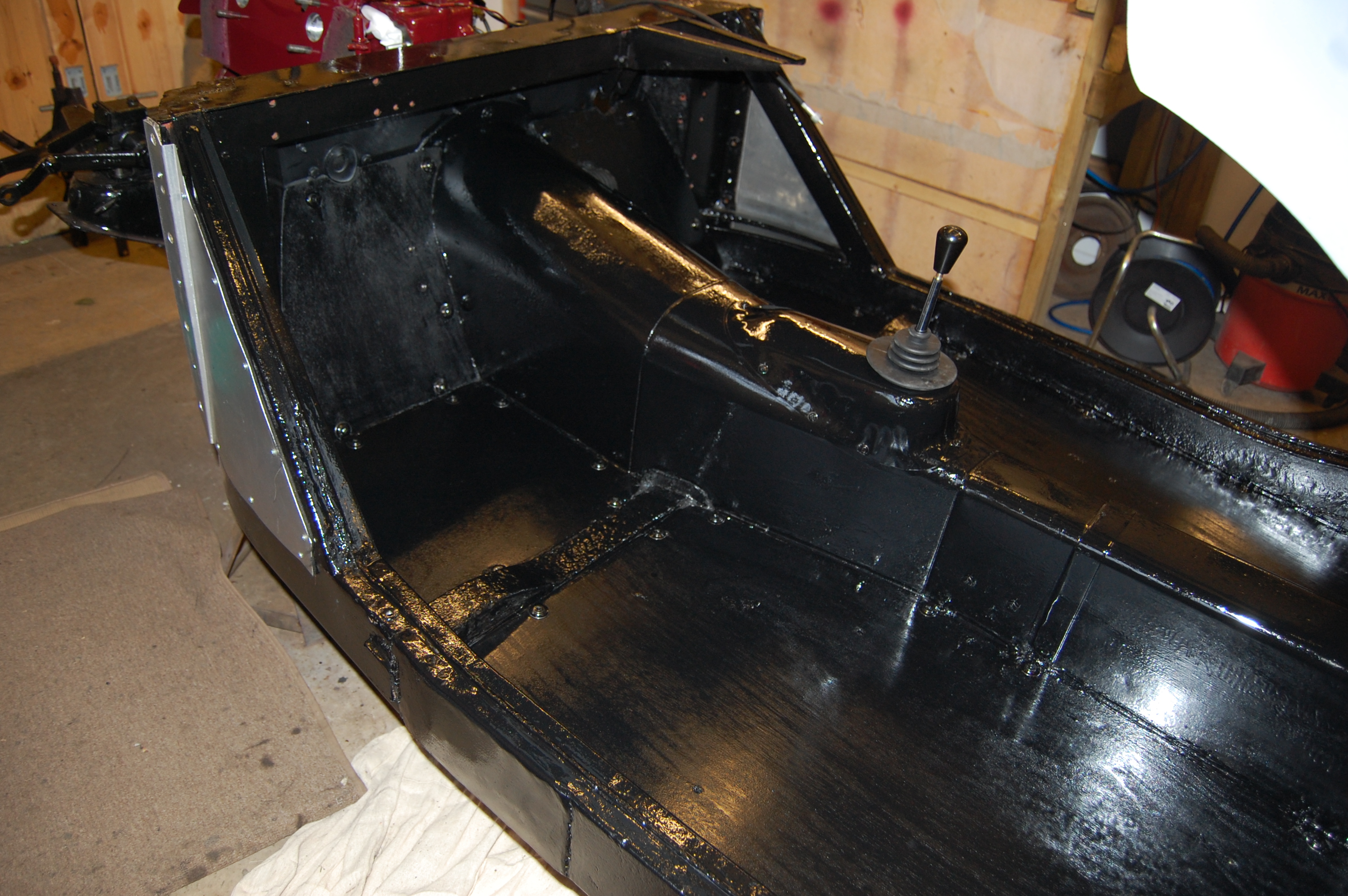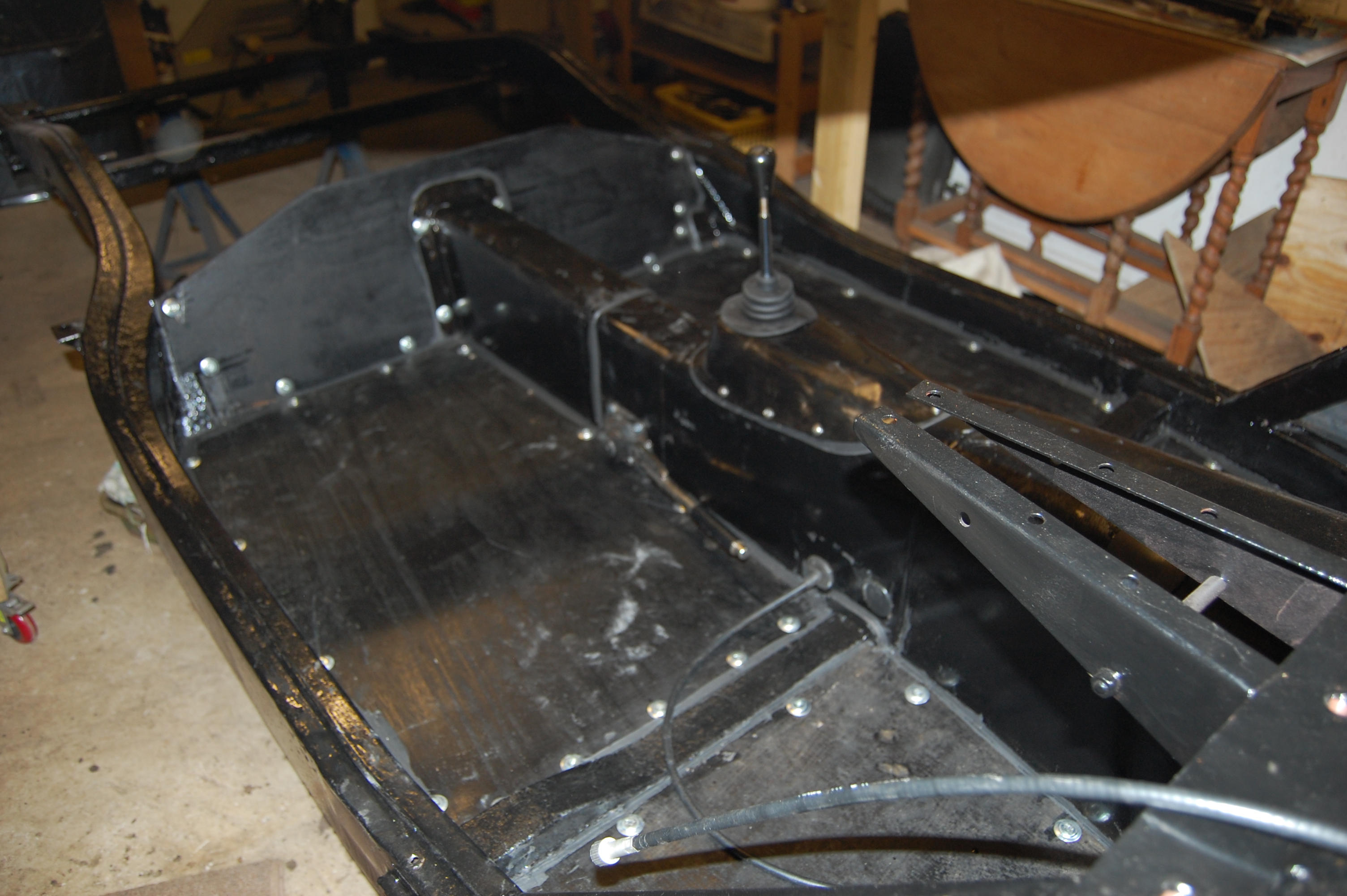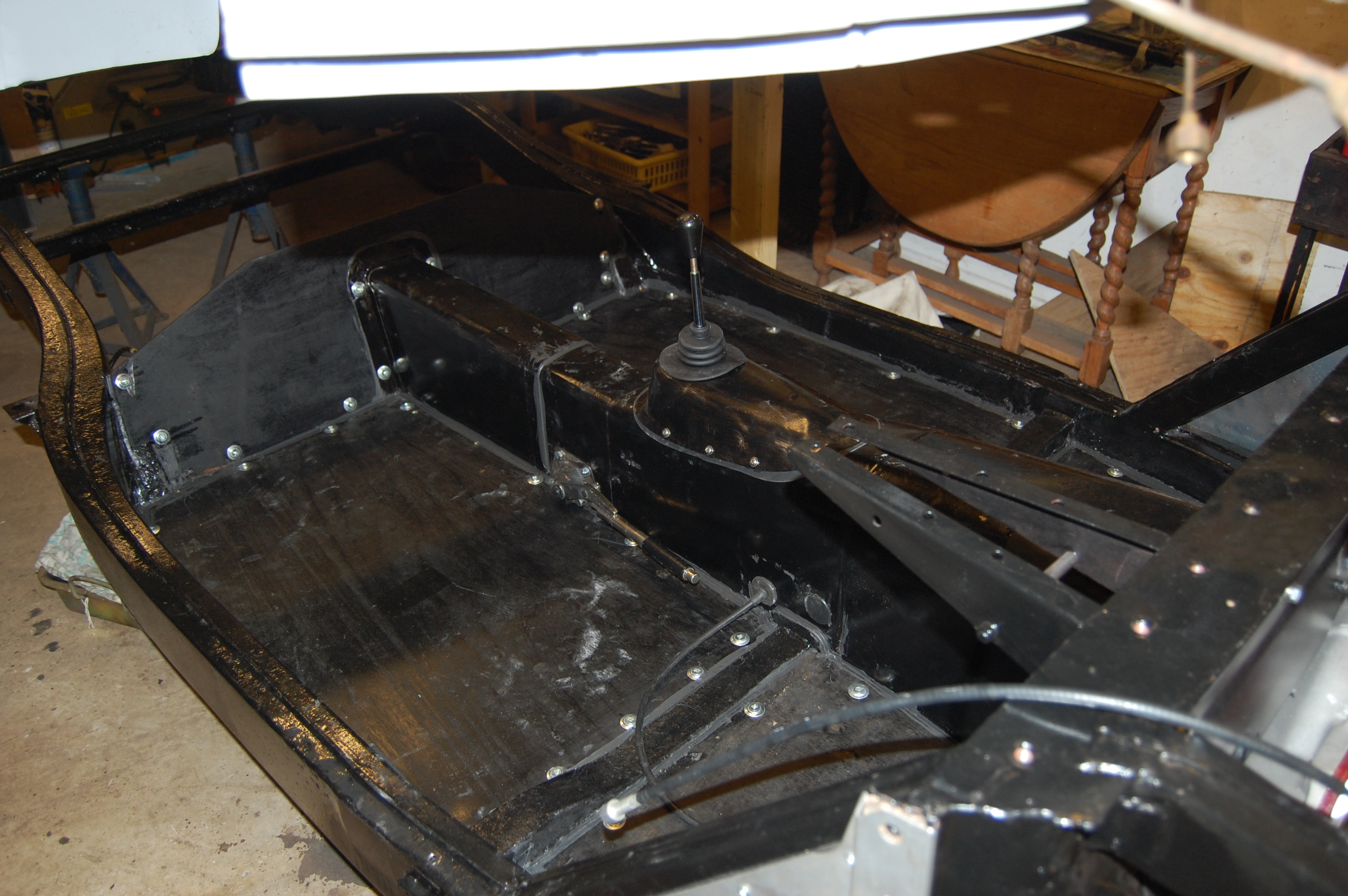 Final painting of boards and finished gearbox/propshaft tunnel. Positioning and routing of speedo cable for 5 speed conversion can be seen, which will eventually be hidden under the carpet.