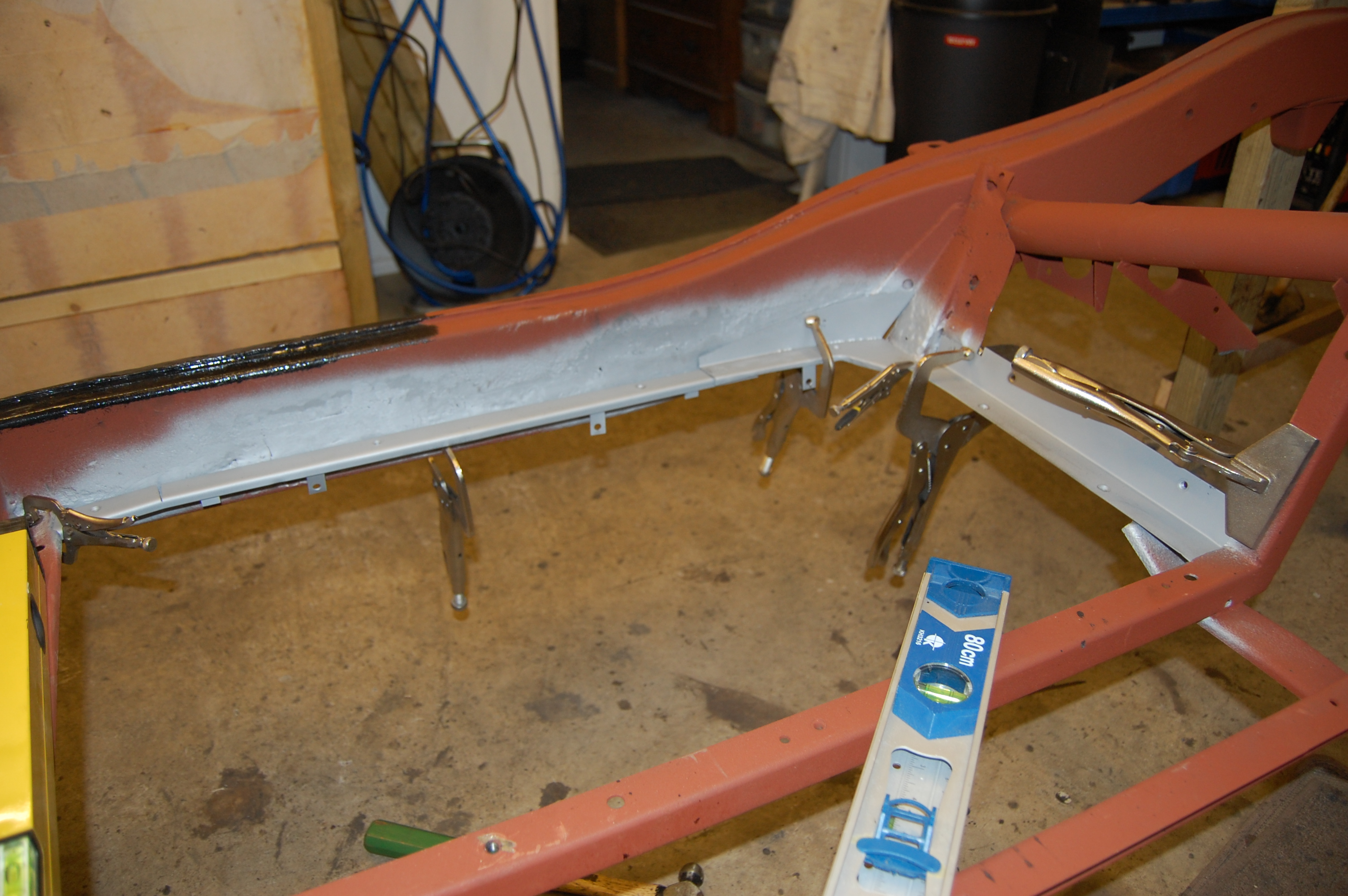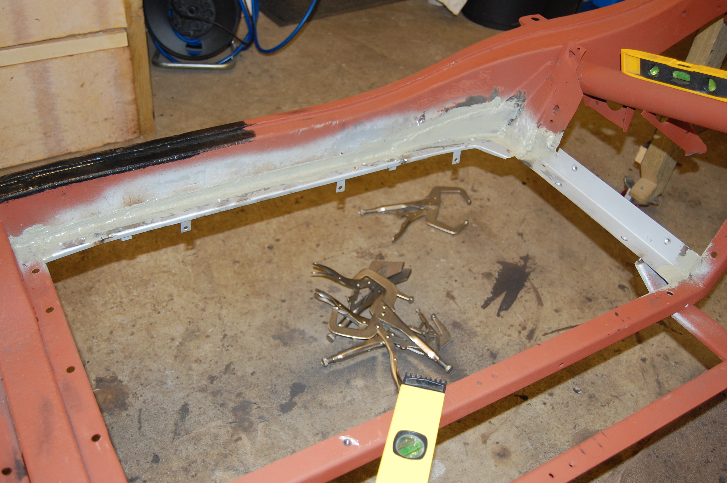 First task is to cut out and remove all traces of the old rusted rails and grind surfaces back to accept the new rails. Use of weld-thru primer is a good idea here, to prevent any possibility of rust occuring as a result of the welding process.