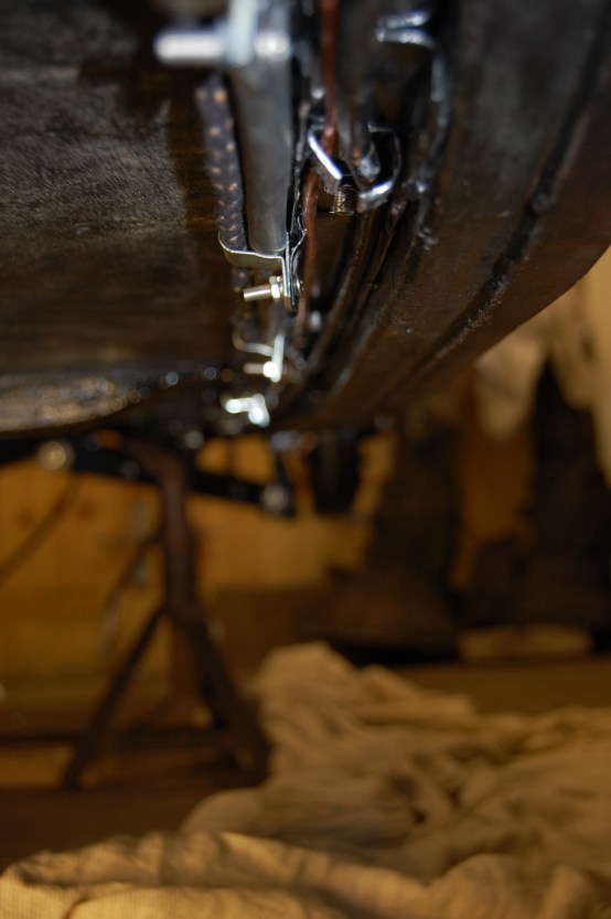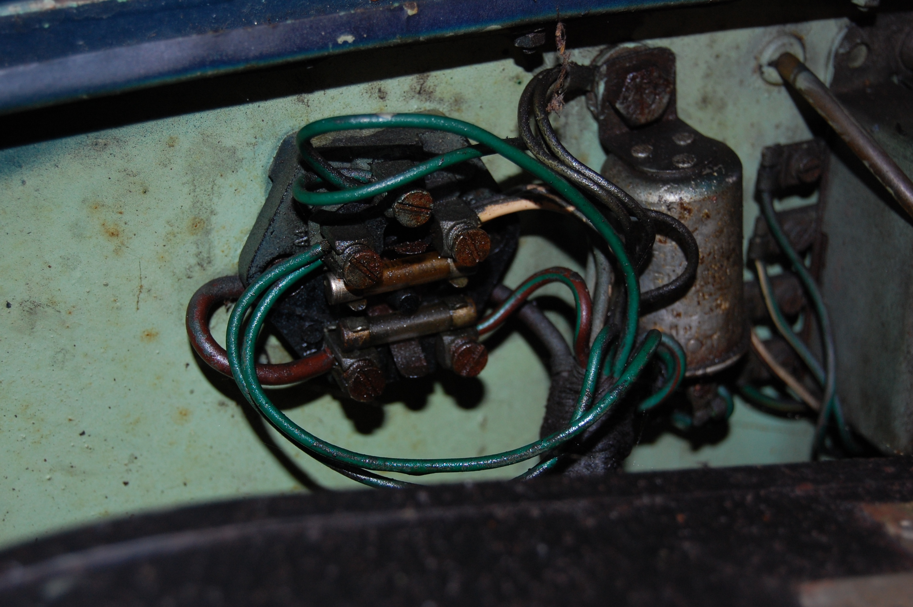 Note the earth lead connected to the elongated wing/fender bolt as was original, also that the fog lamp connector which is unused, is exposed – since insulated with a female bullet connector.
