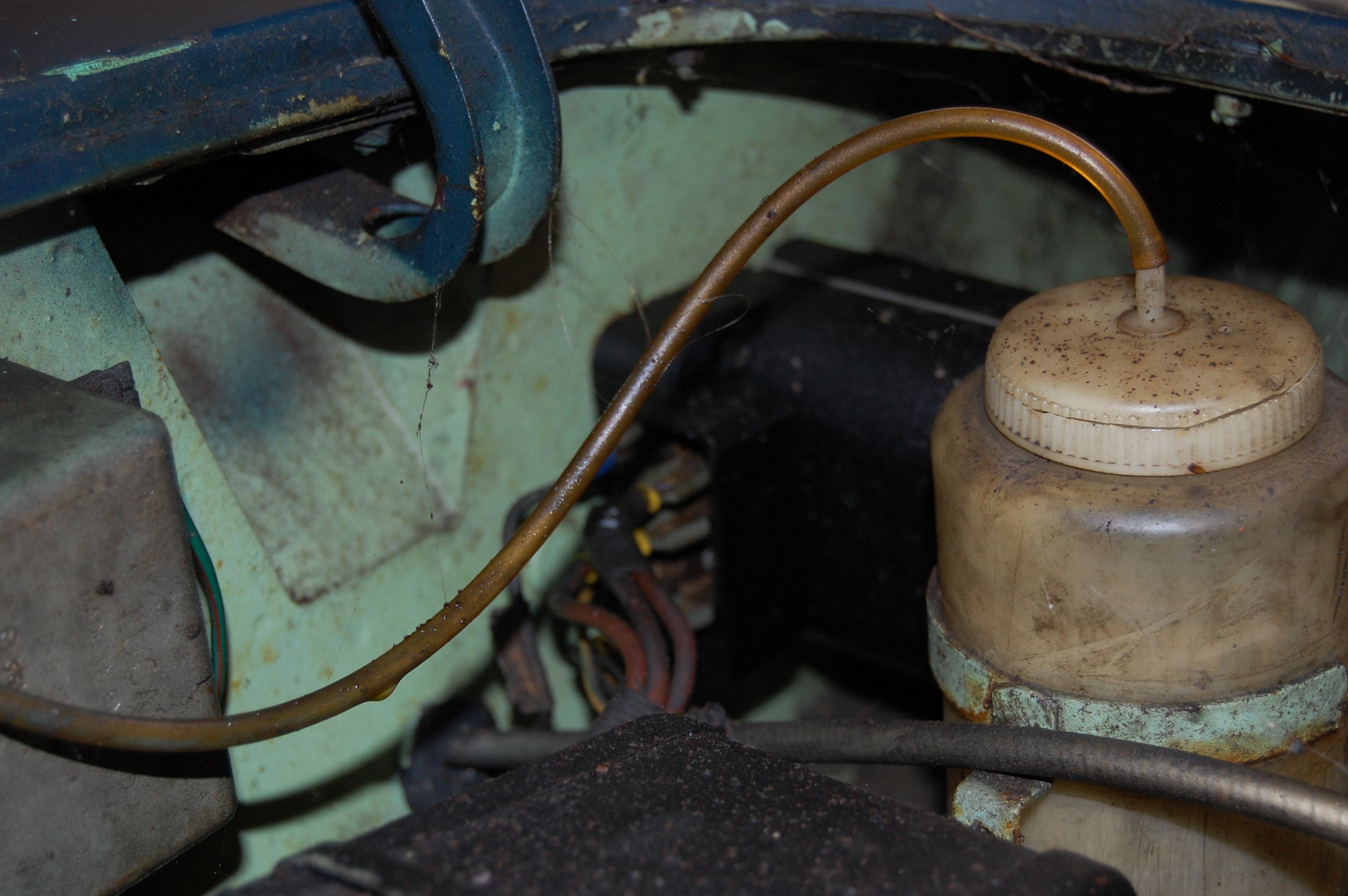 Fuel pipe from pump to carbs. The lower pipe is the rear brake pipe showing the attachment point on the right-hand battery carrier.