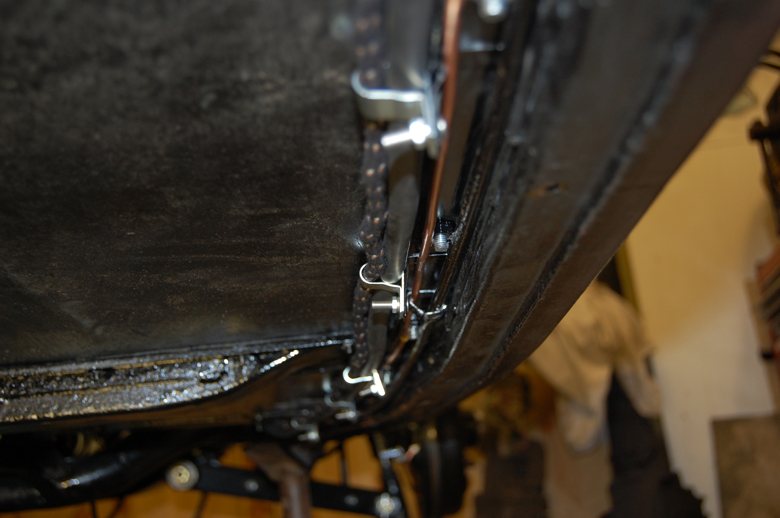 The retaining clips for the fuel and brake lines are in the form of tabs attached to the outer floorboard rail and are simply bent into position once the lines are in place.