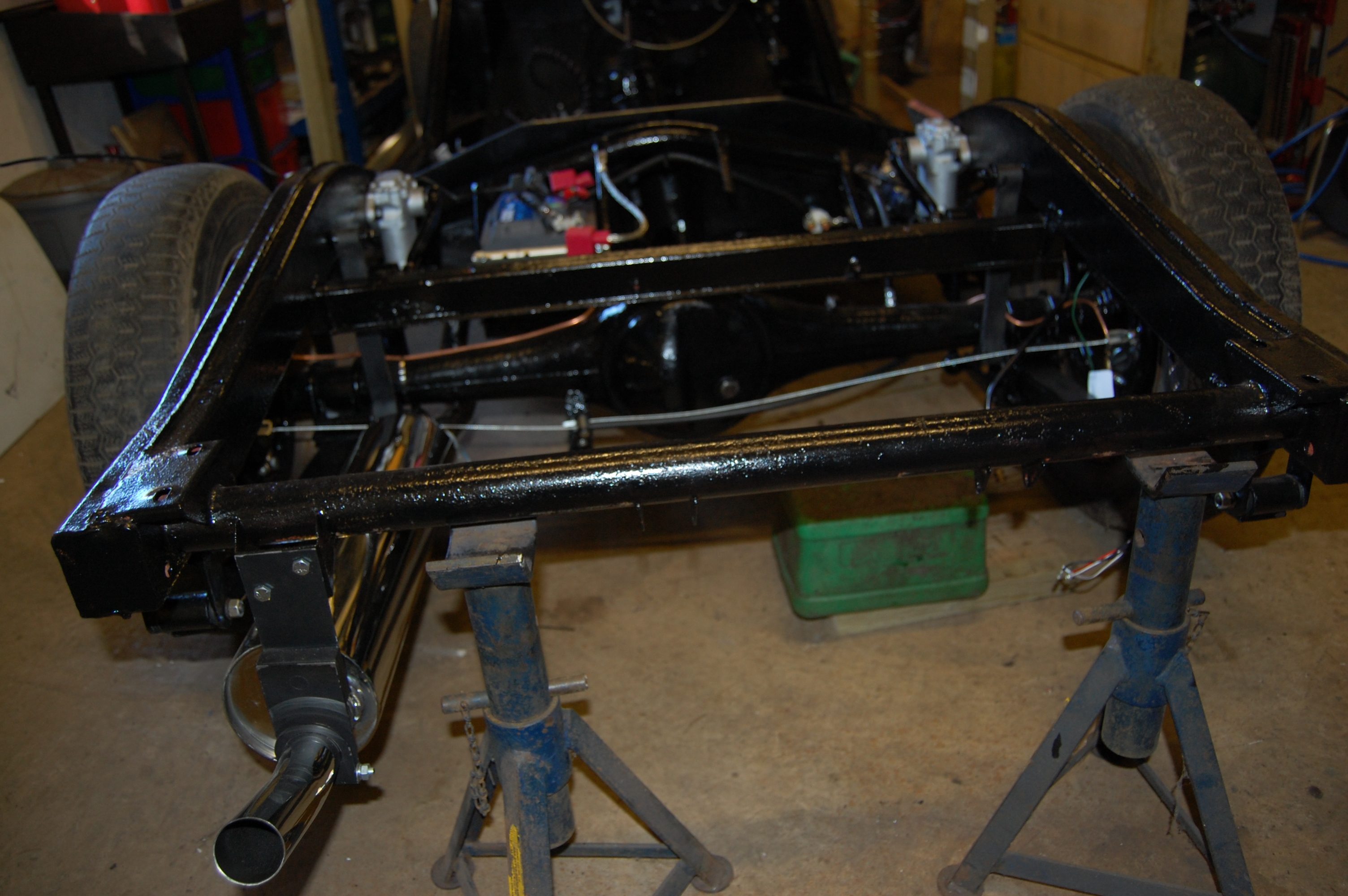 Chasssis temporarily off stands and on original wheels and tyres. Original 41 year old Michelin ZX's still hold their pressure, but will be replaced once the wheels have been blasted and painted.