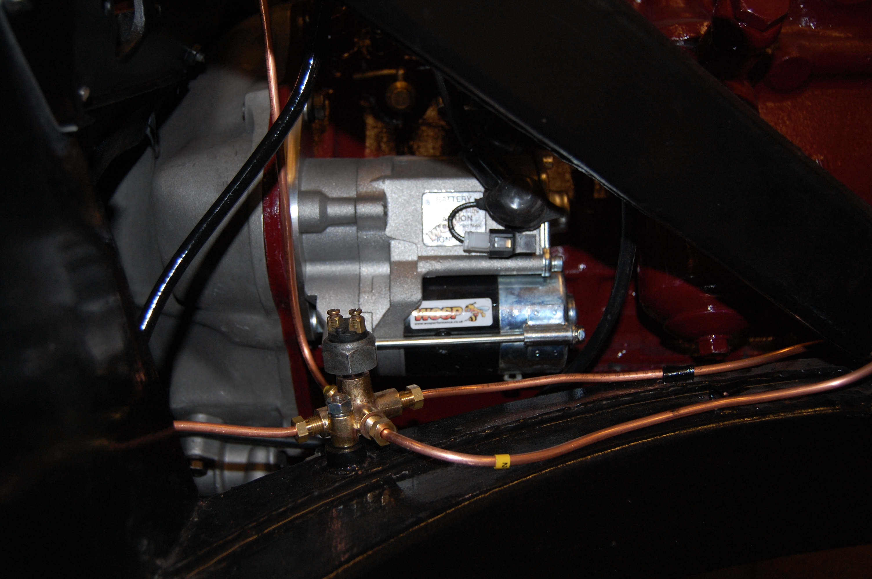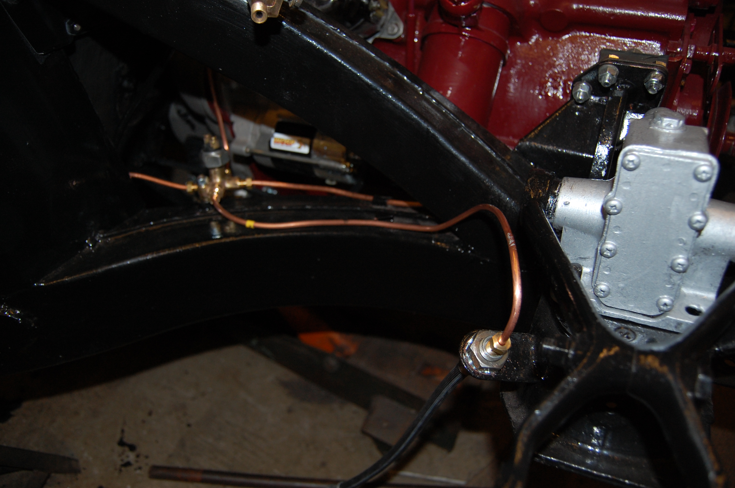 Three-way union and brake light switch mounted on the chassis to the right and forward of the chassis goal-posts. this is the original one cleaned up.