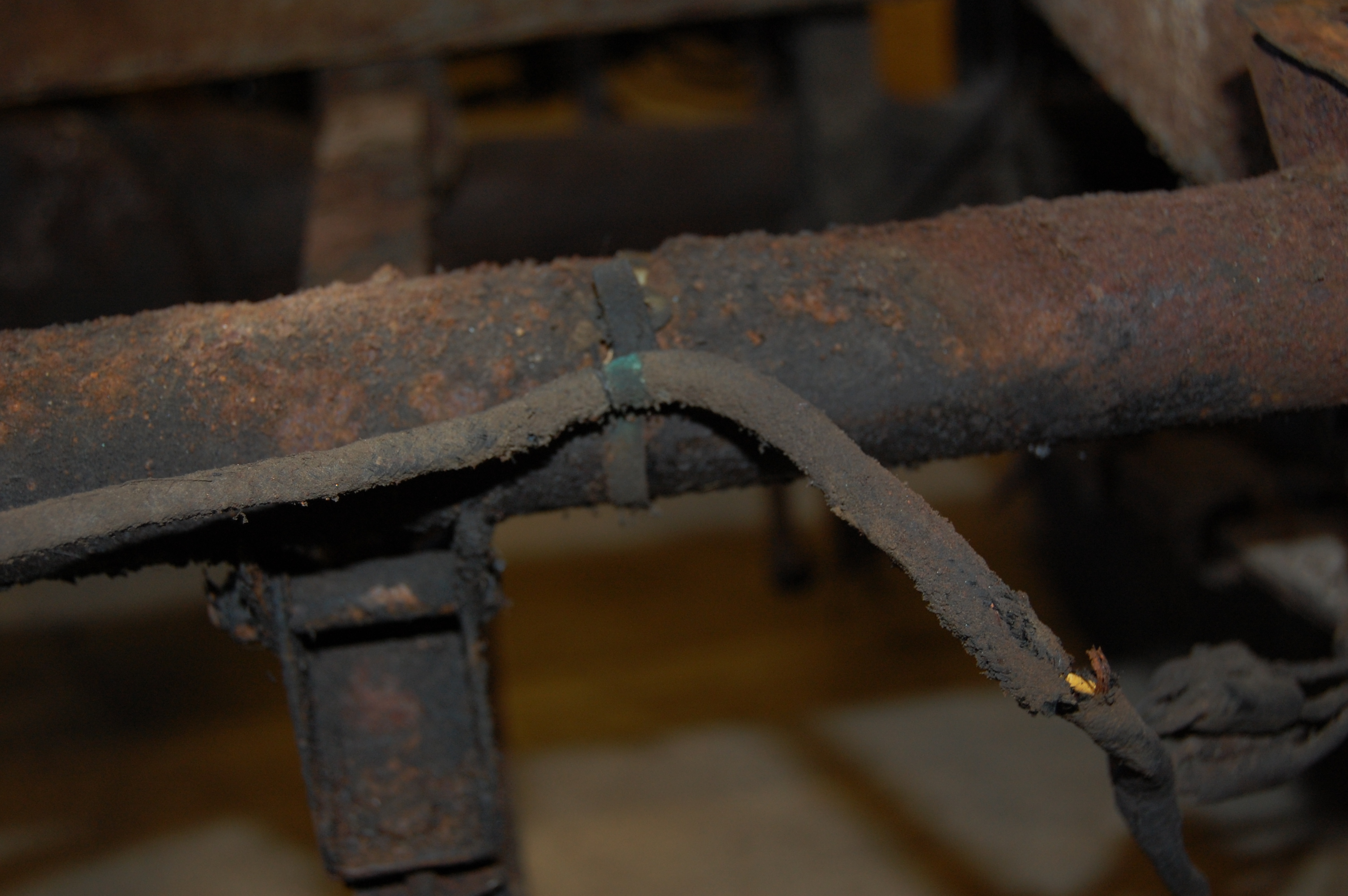From the rear of the chassis the battery cable and side loom share the same ‘p’ clips mounted on vertical tabs attached to the floorboard rails. the main brake pipe front to rear and the fuel pipe share the parallel route between the floorboard rails and the chassis side (clip needs tightening!)