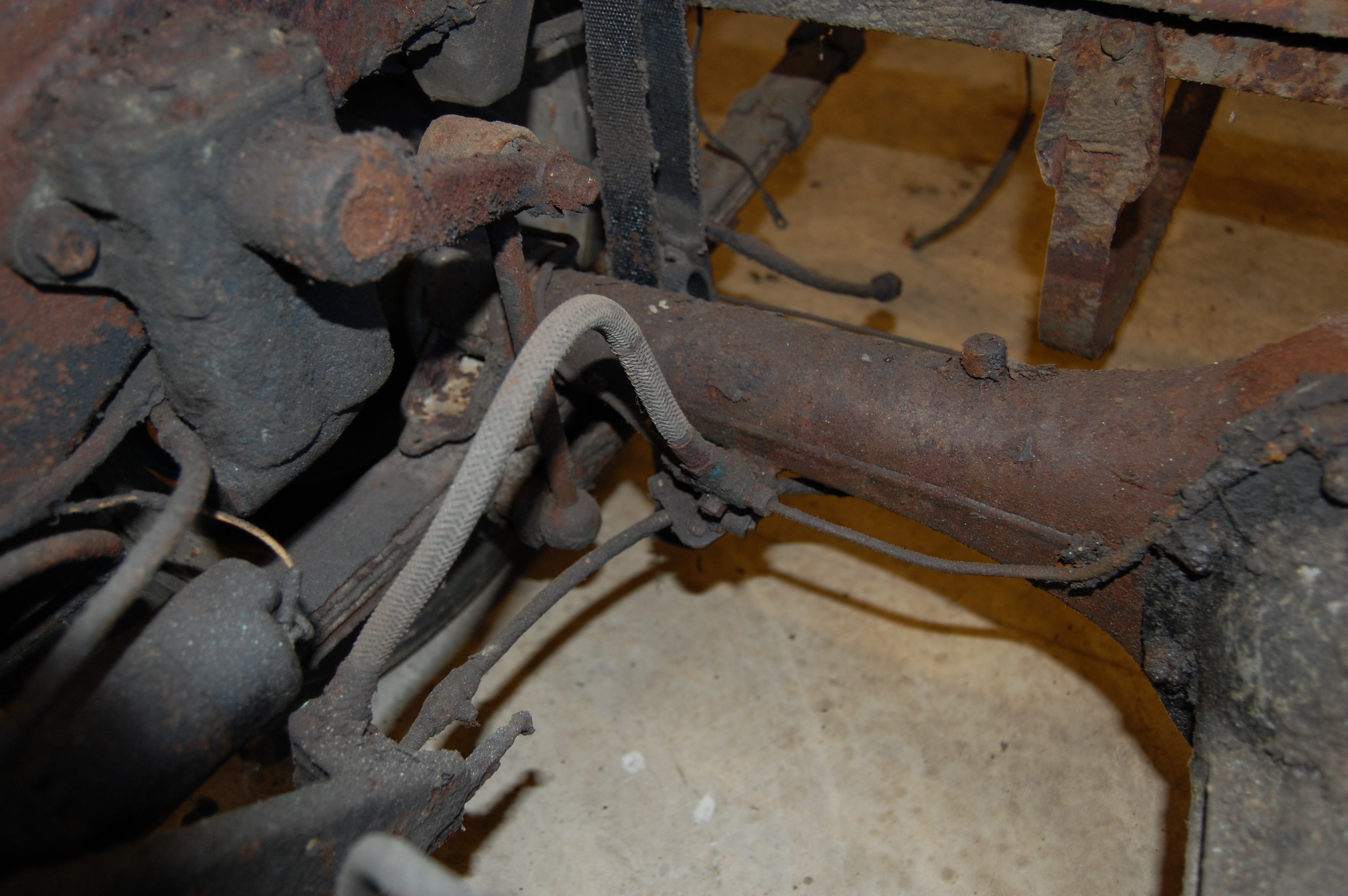 Of note here is the position of the rear brake flexible pipe from the battery carrier union to the two-way union where the pipes are split left to right, the right-hand pipe looping over the differential.