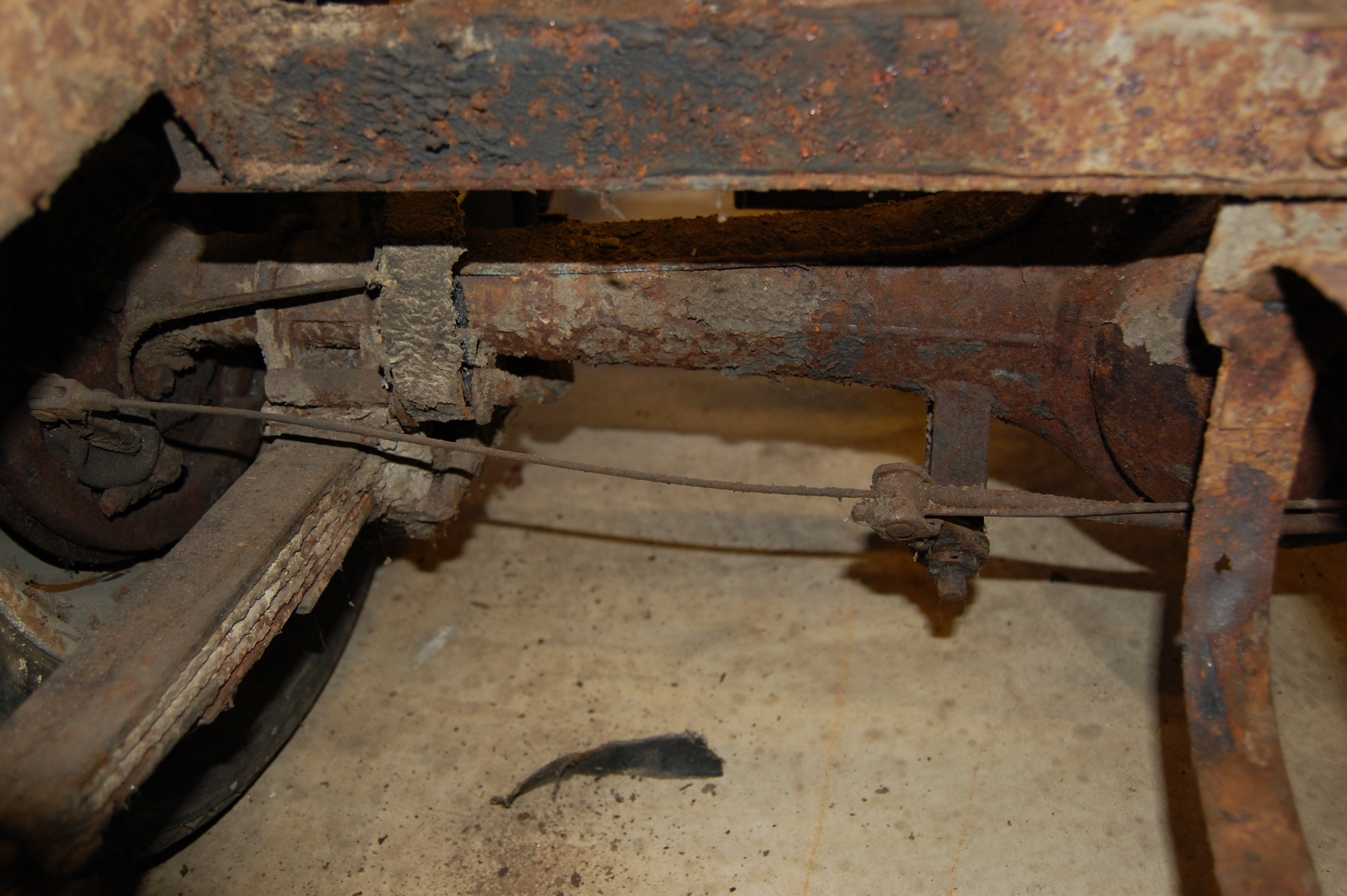 Left to right – Clutch pipe, master cylinder to slave cylinder – brake pipe, three-way union to rear brakes – main battery to solenoid cable – fuel pipe, fuel pump to carbs.