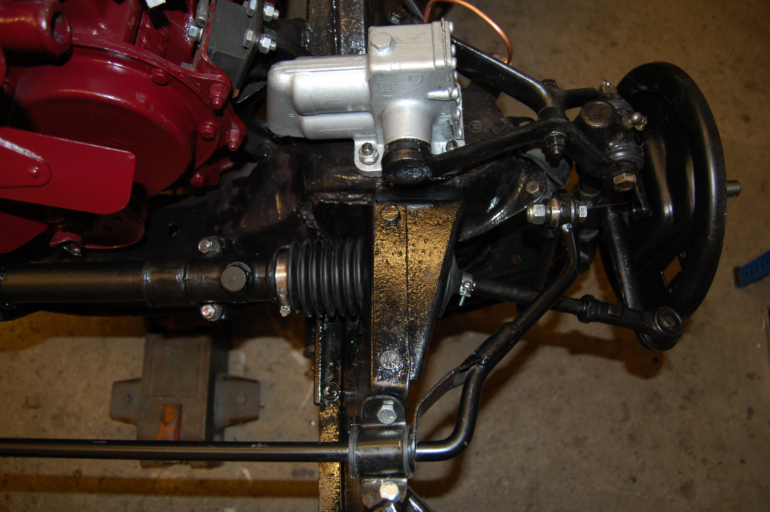 For fitting the trunnions and new rubber seals to the king-pins, reference should be made to the workshop manual to be sure. It’s a bit of a fiddle single handed, but eventually it all went together. The front wishbone has the reinforced outer bolt hole to take the anti-roll bar, which can only be fitted after the chassis extension is back in place.