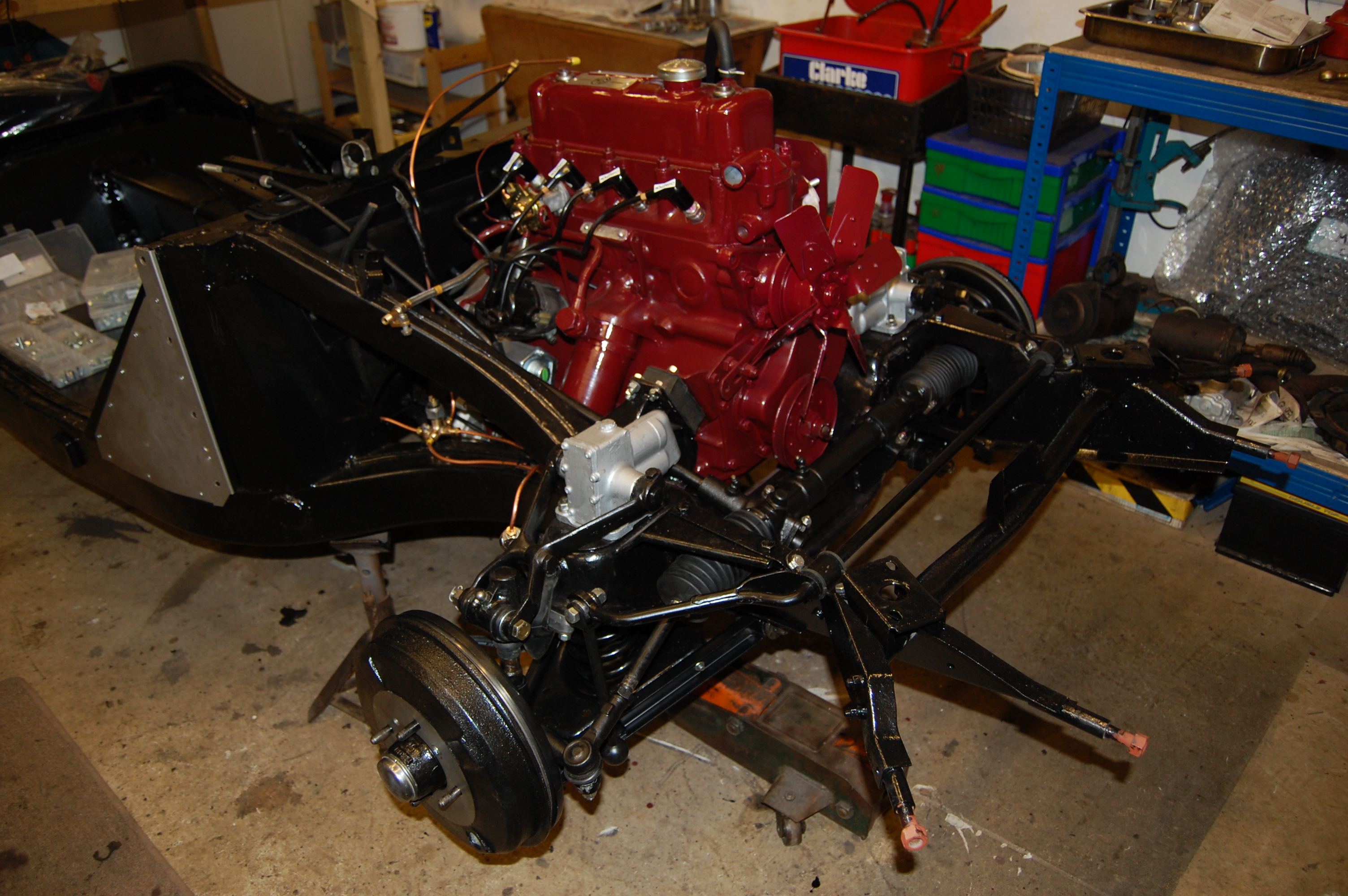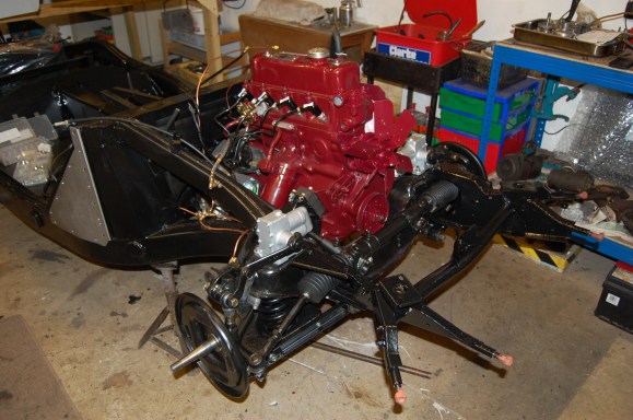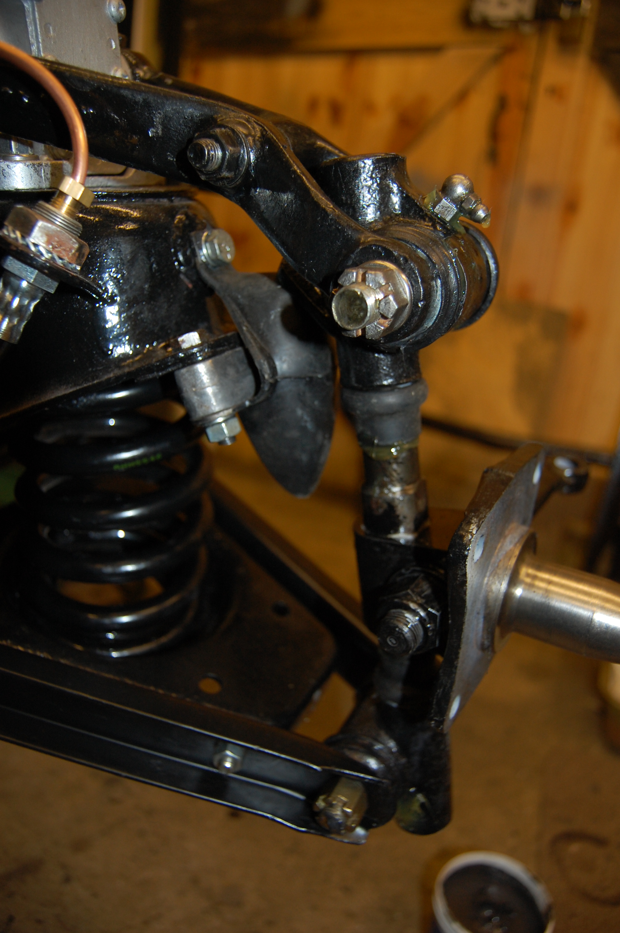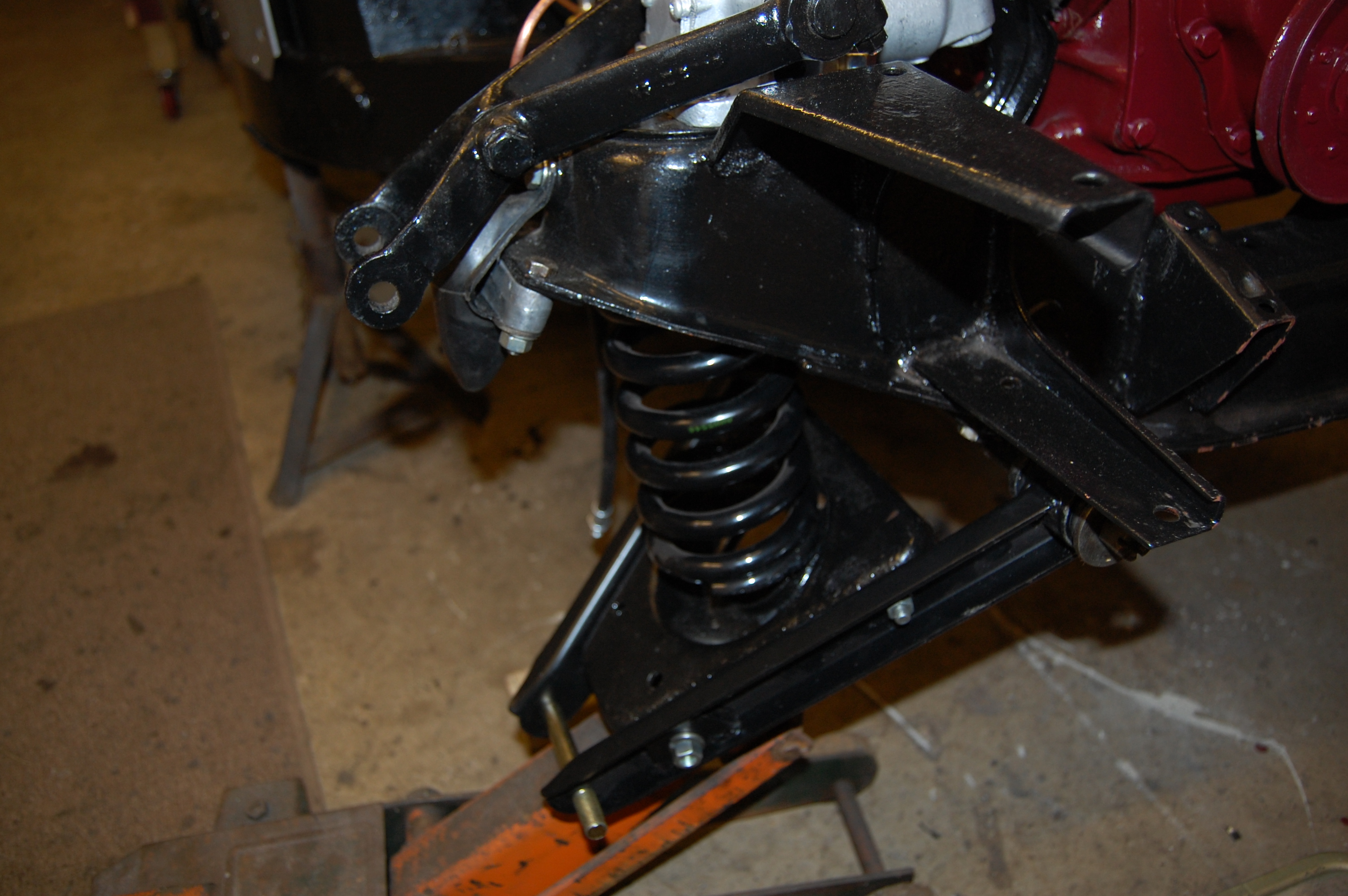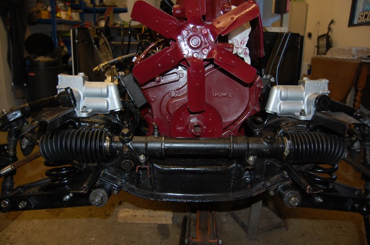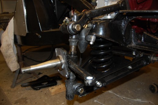 New wishbones fitted which included the additional reinforced hole for retrospective anti-roll bar fitting. I fitted the heavy duty MGB V8 inner wishbone bushes, which are kept slack until the car is eventually back on it’s wheels. A small jack under the spring pan acts a spring compressor.