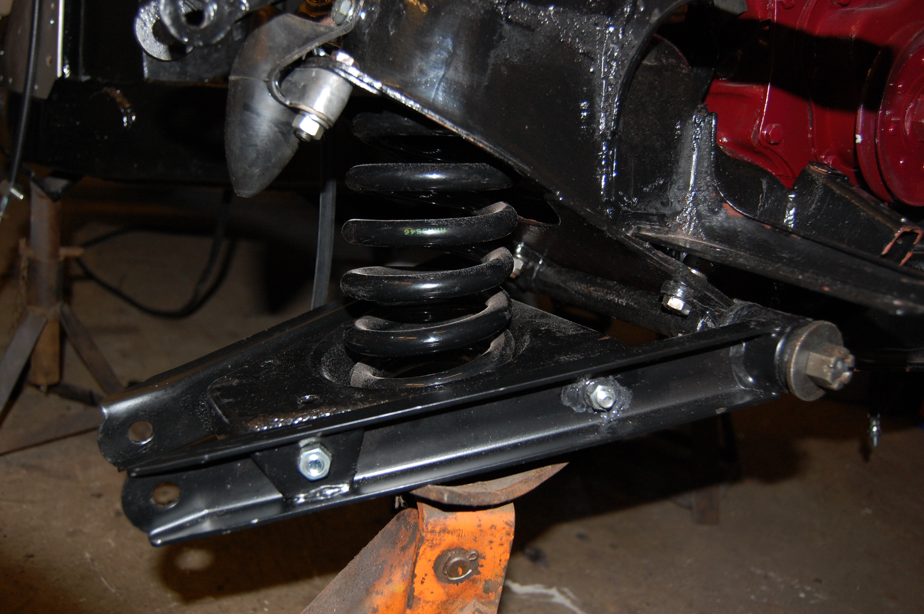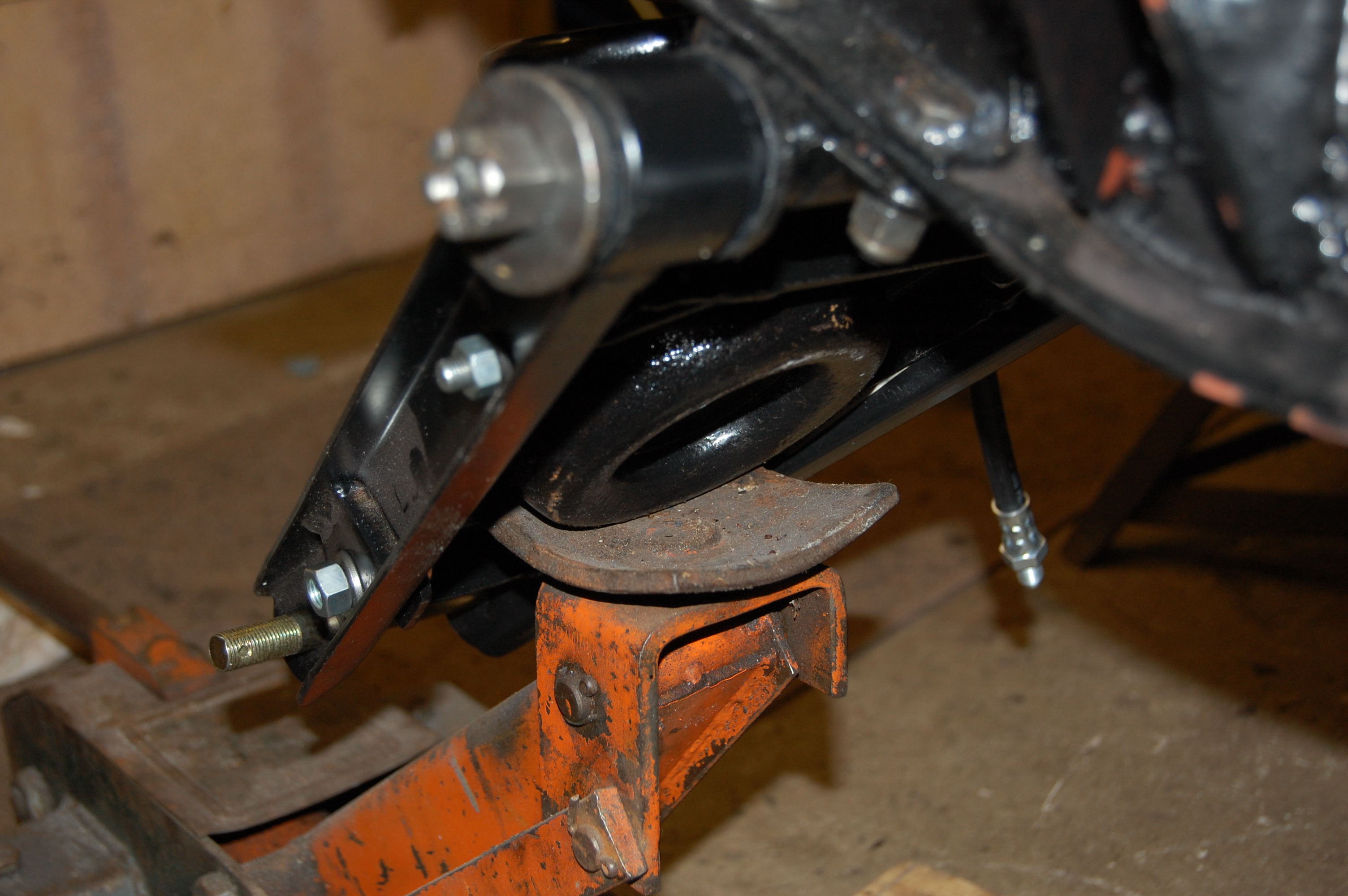 Compressing the new springs to enable fitting of the swivel pin assembly. Even with the weight of the engine, the chassis started to lift before the required height was achieved. I added weight by loading two old gearboxes onto the chassis. An option here is to find a couple of willing and preferably weighty helpers to stand on the chassis. The outer bolt connecting the wishbone to the pan in this shot is temporary, as this will eventually take the anti-roll bar.